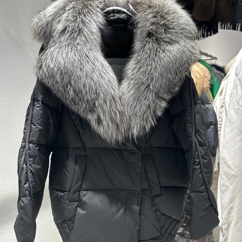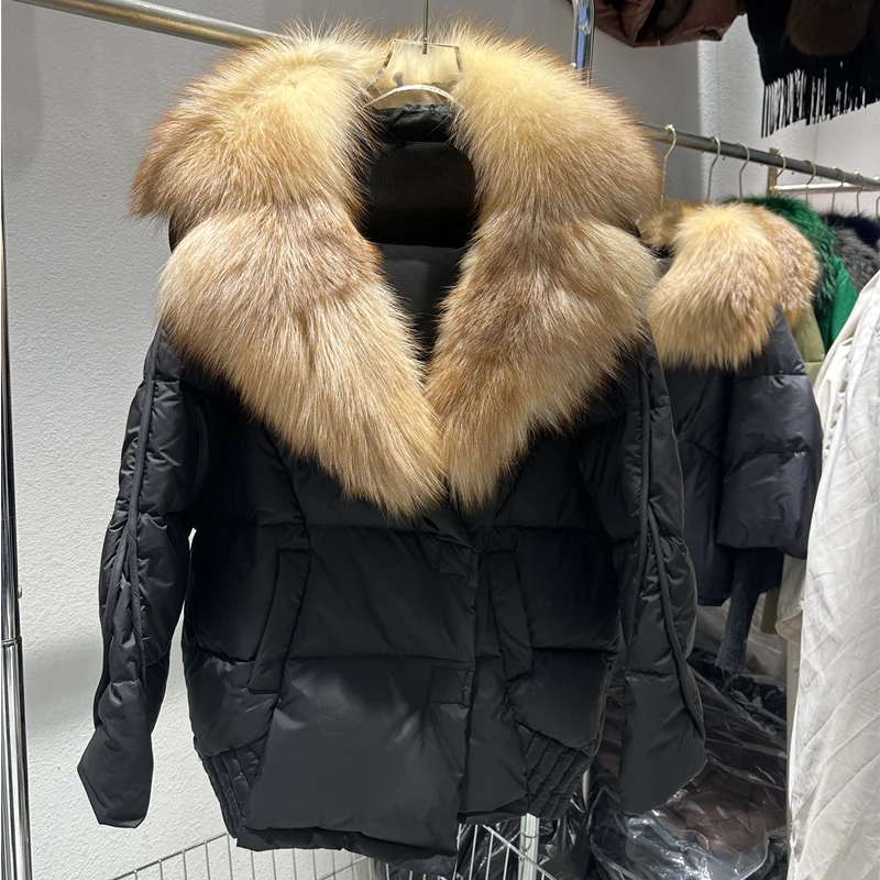 MENINA BONITA 2023 Loose Real Fox Fur Collar Coat Winter Thick Women Warm Jacket 90% White Duck Down Outwear Female Streetwear