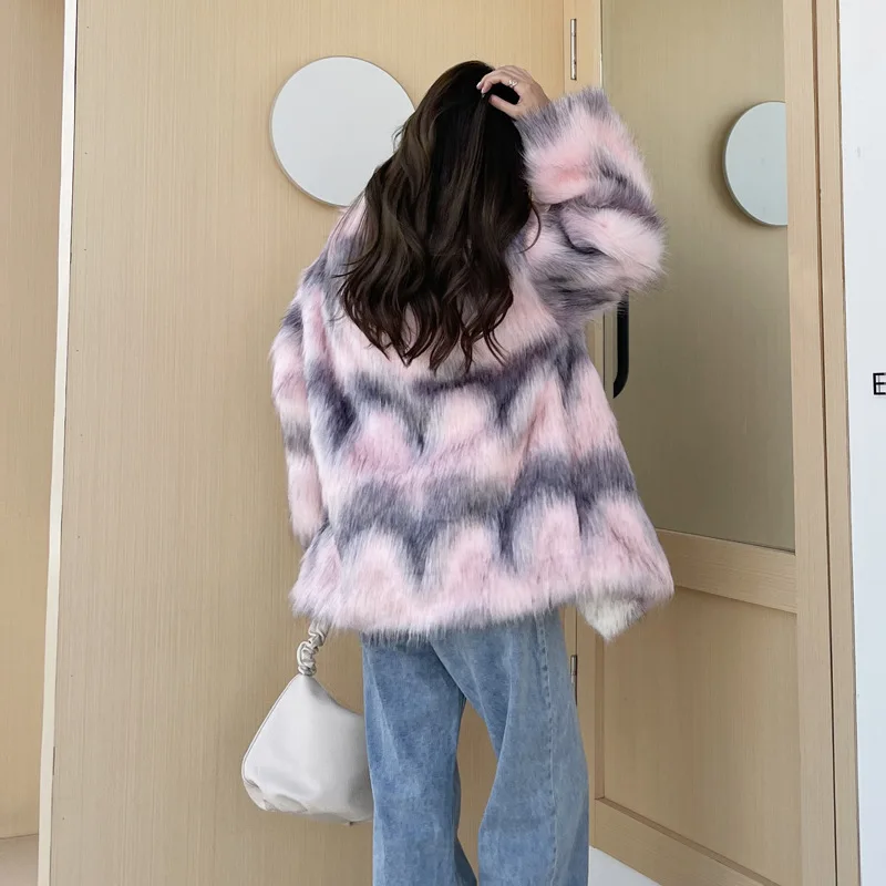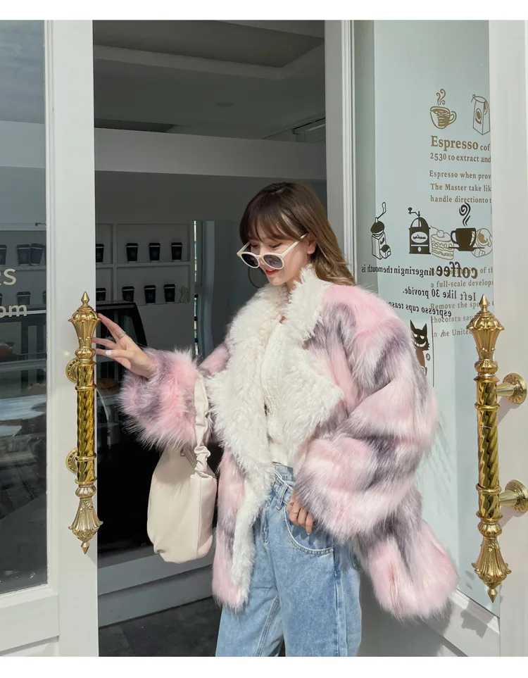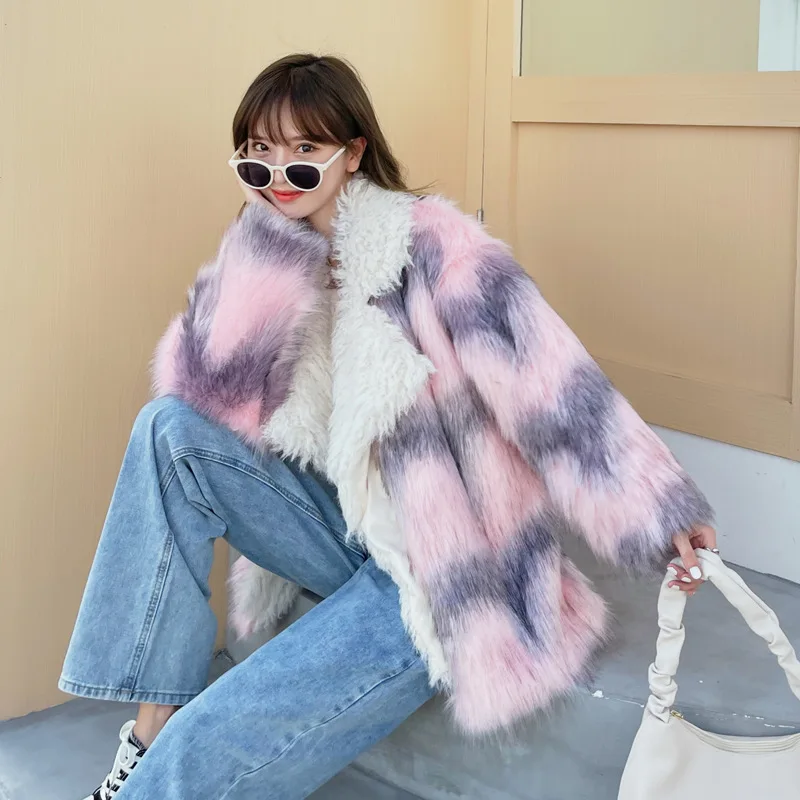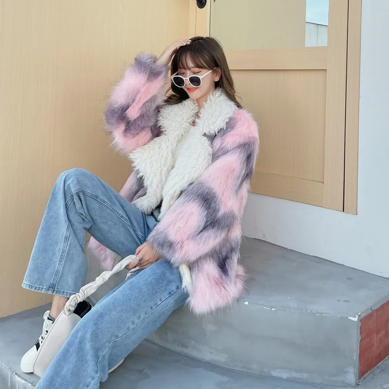 winter new Fur imitation fox fur medium length lapel pink gray floral fur patchwork lamb fur jacket