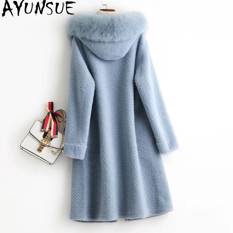 AYUNSUE Winter Jacket Women 2021 Hooded Real Sheep Shearing Fox Fur Collar Coat Female Elegant Wool Jackets Manteau Femme Gxy520
