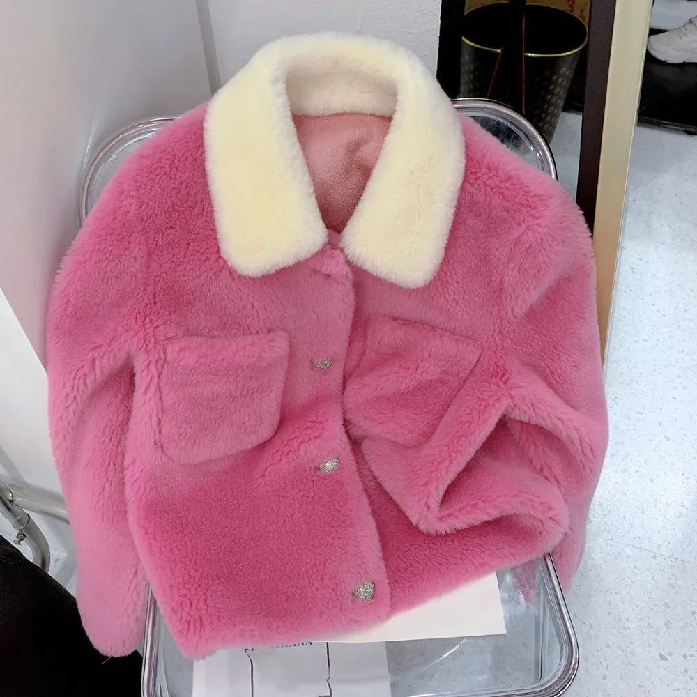 2022 Autumn Winter Chic Women High Quality Wool Fur Leather Pockets Jackets Coat F032