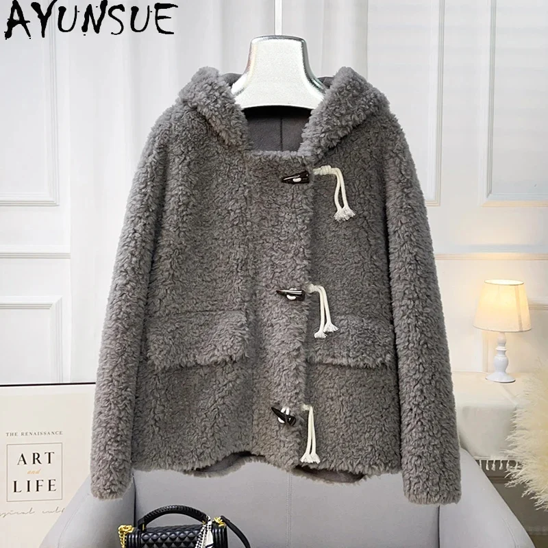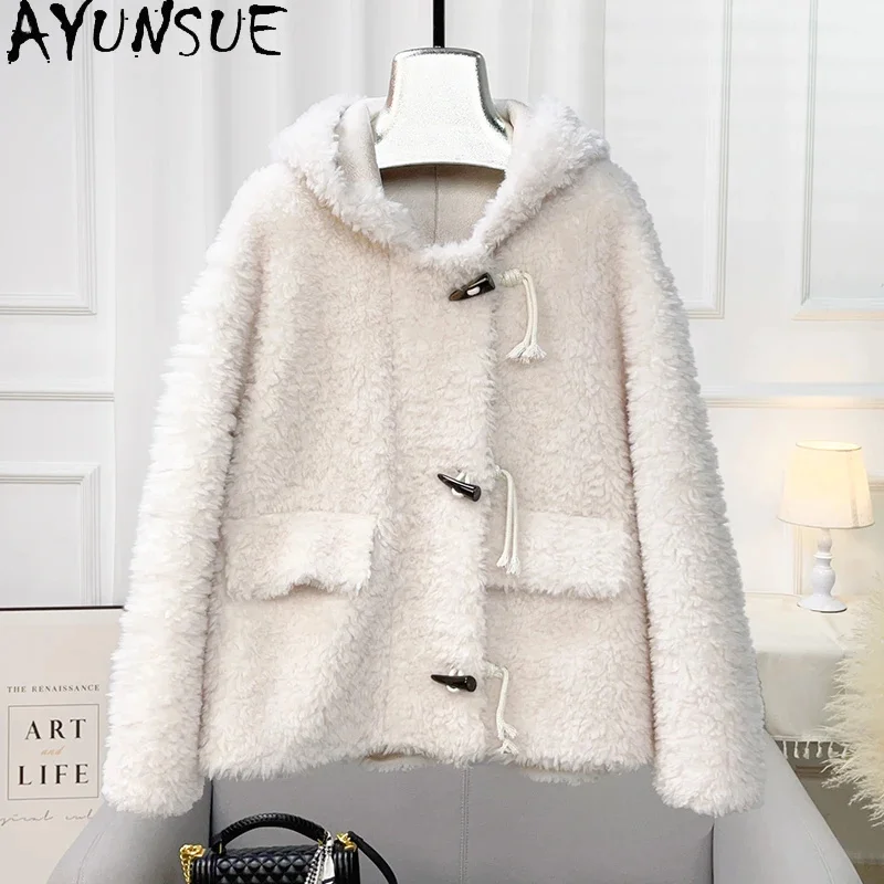 Autumn AYUNSUE and Winter New Lamb Wool Coat Women Horn Button Hooded Short Pure Sheep Shearing Jacket Casaco Feminino