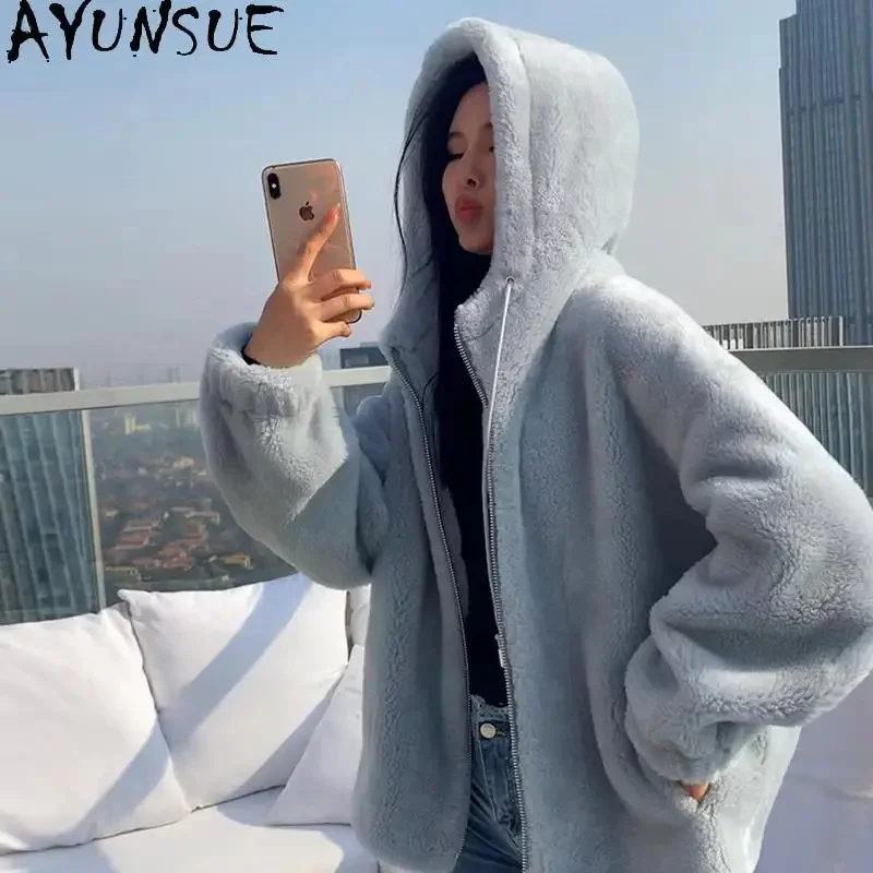 100% AYUNSUE Granular Wool Coats for Women 2024 Autumn Winter Hooded Sheep Shearing Jacket Loose Outerwears Chaquetas Para Mujer