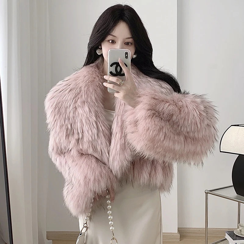 2024 New Winter Natural Raccoon Fur Coat Women High-waist Jacket Long Sleeve Big Turn-down Collar Thick Warm Fur Outerwear Short