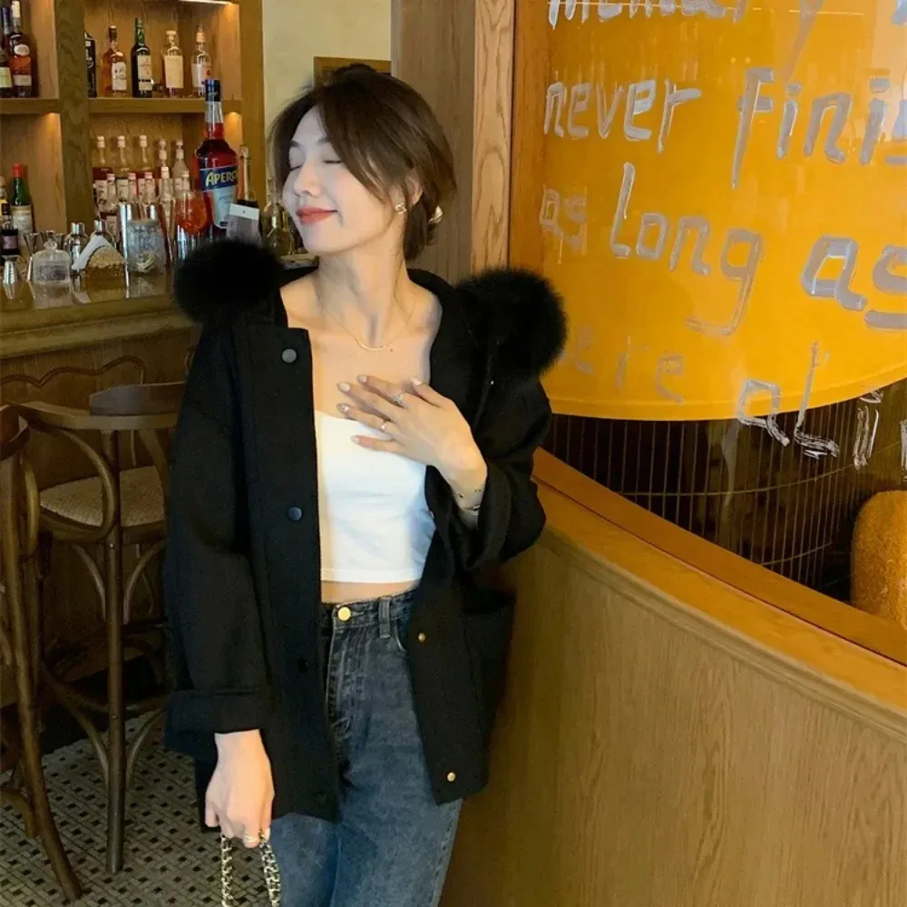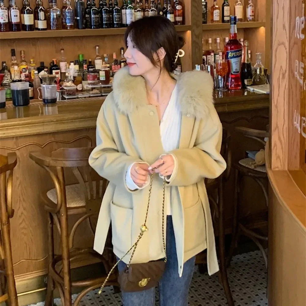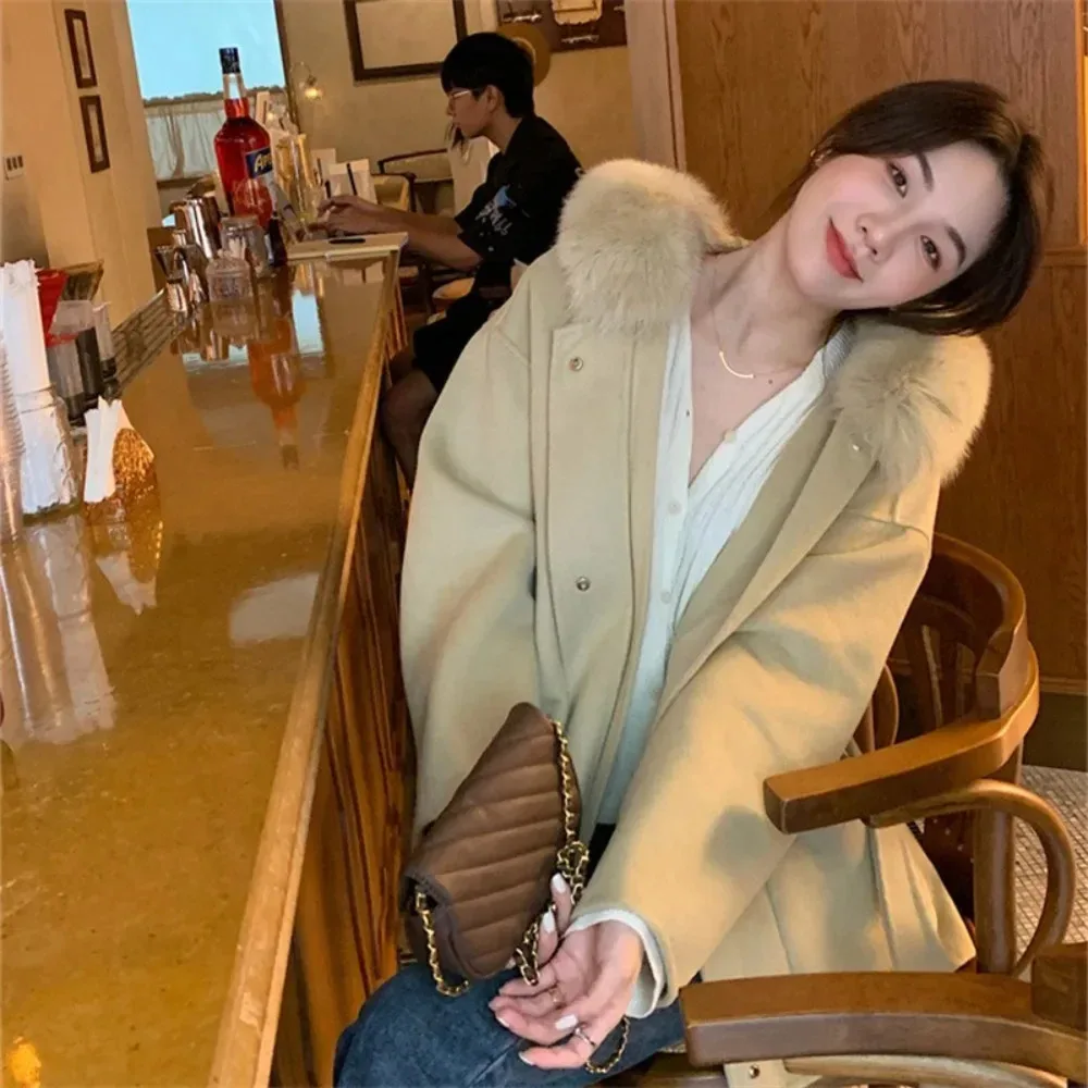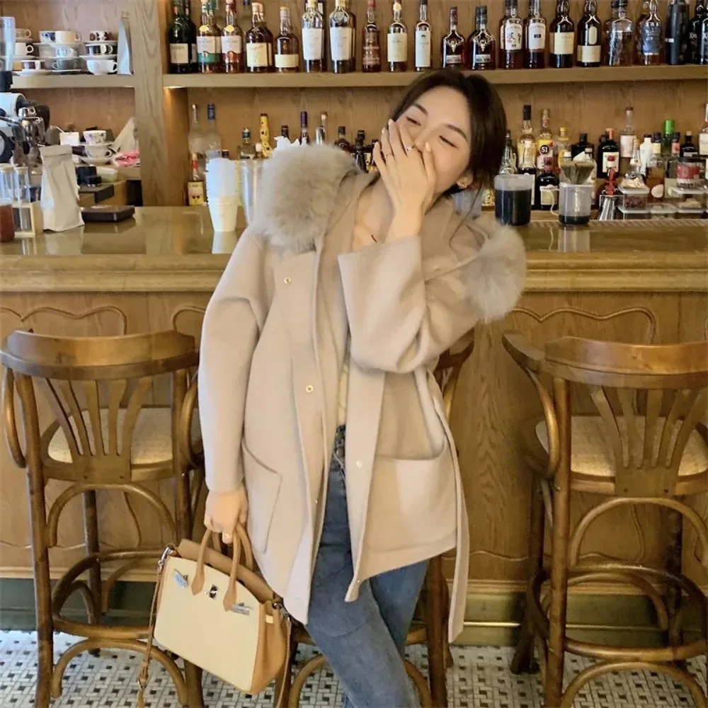 2024 Real Fur Fox Woolen Coat Female New Women Loose Temperament Large Size Thickened Parkas Big Fur Collar Hooded Outwear