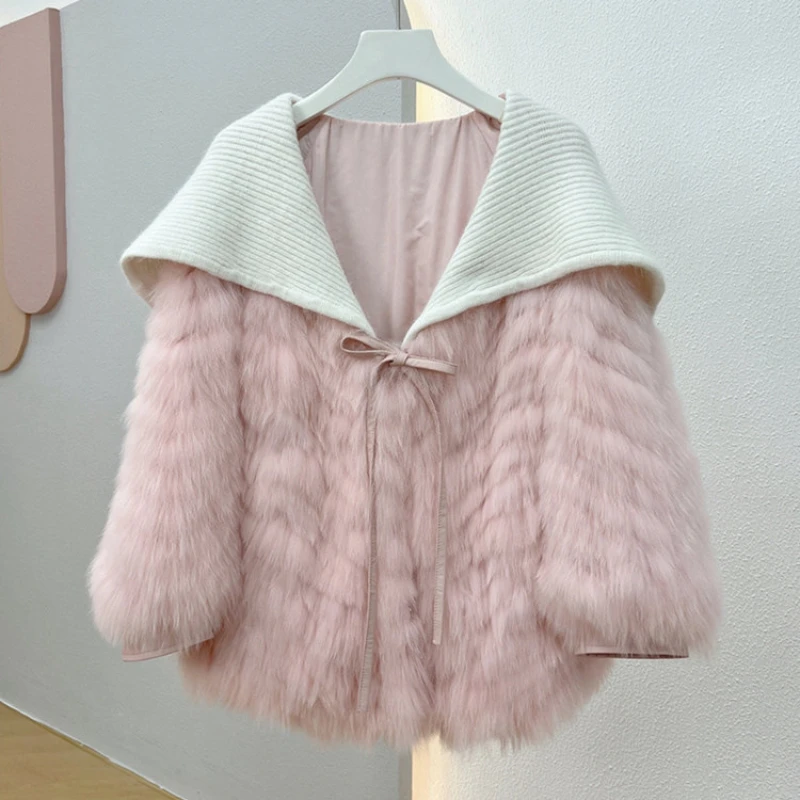 MENINA BONITA 2023 Knitted Navy Collar Real Fur Coats Women Jacket Warm Winter Natural Fox Fur Stripe Sewed Toghter Streetwear