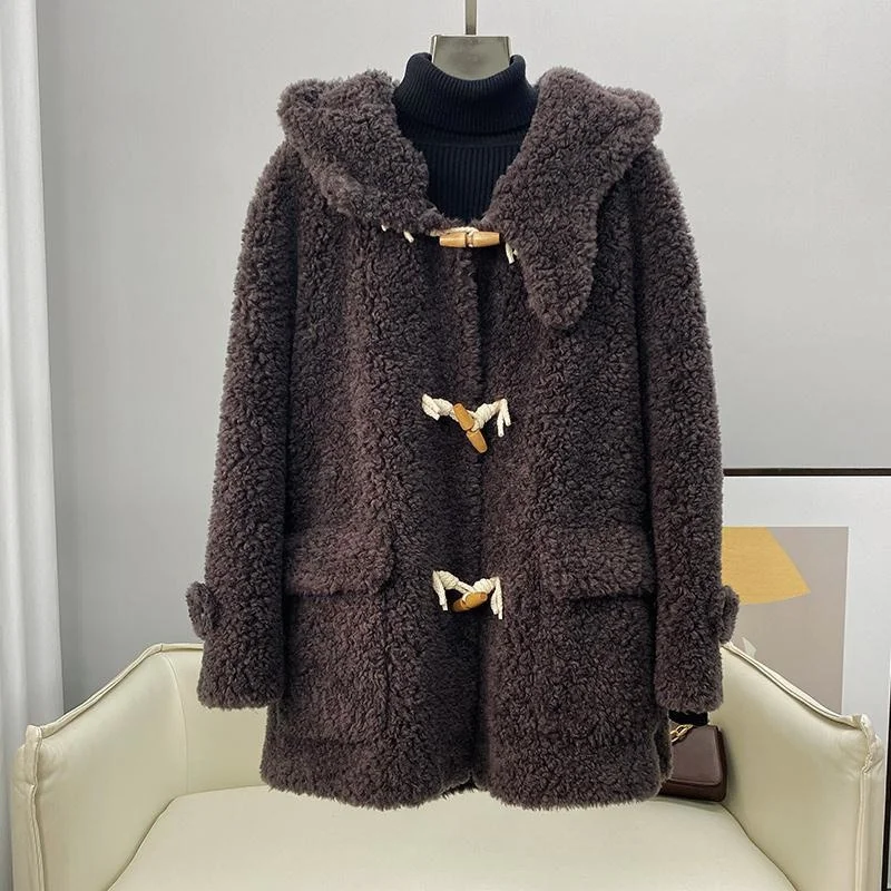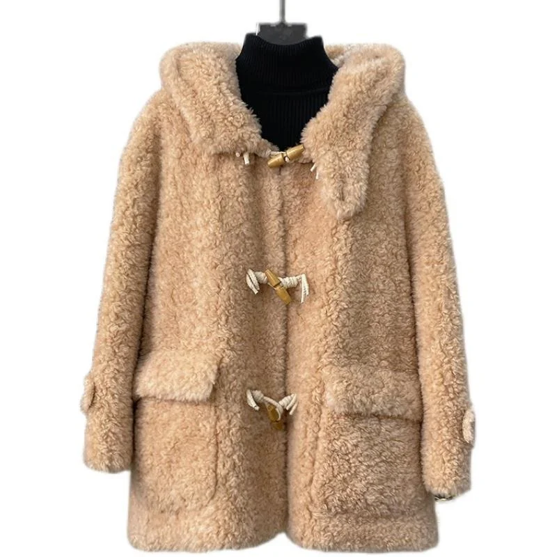 2023 Autumn Women Winter New Genuine Lamb Fur Coats Female Long Sleeve Hooded Jackets Ladies Sheep Shearing Warm Outerwear Q07