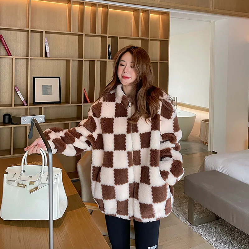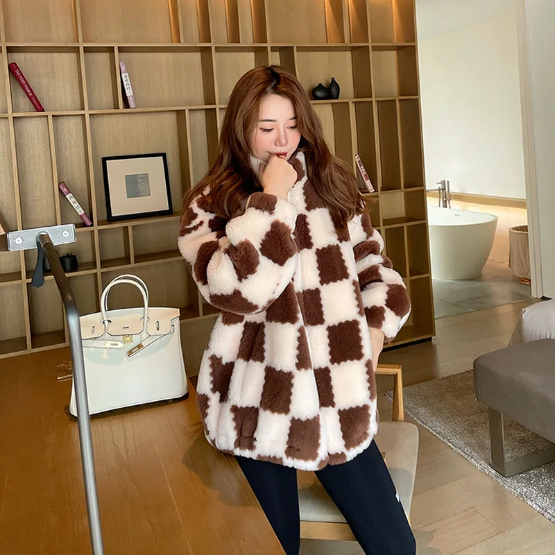 2024 [Sell out but not make up]Full wool chessboard checkerboard grain cashmere lamb fur coat for women with loose cut fleece co