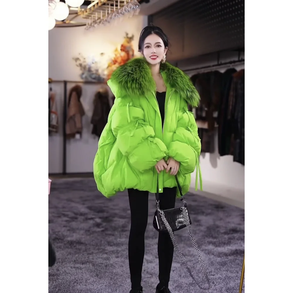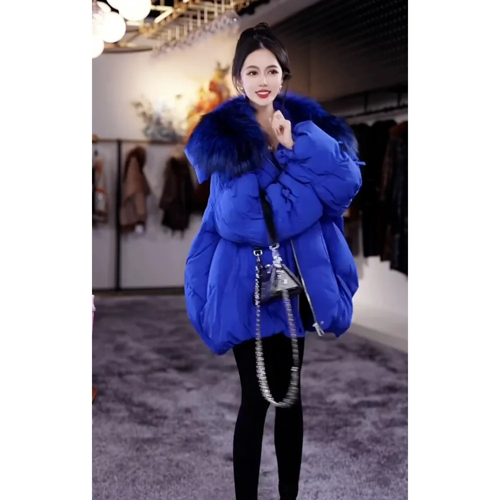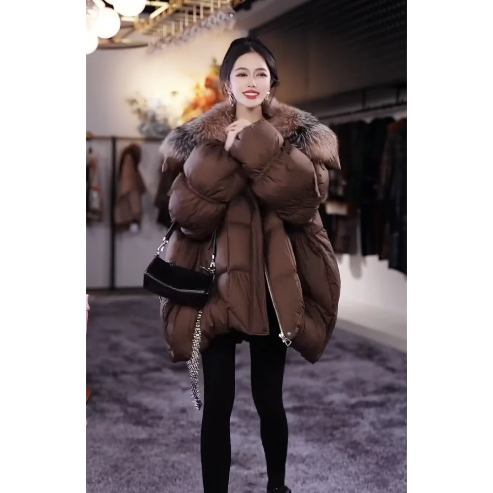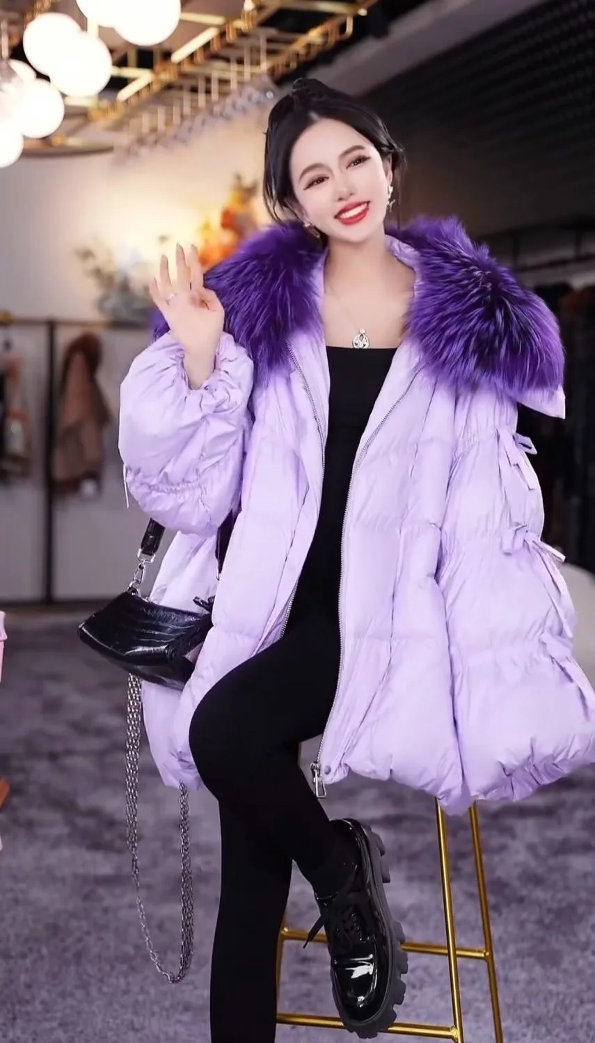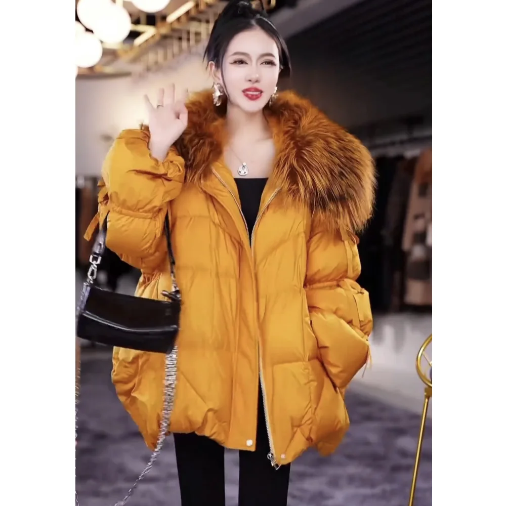 Hot sales Winter new Women Elegant Lantern Sleeve Bow Down Jacket Warm Real Raccoon Fur Collar White Duck Down Bread Coat