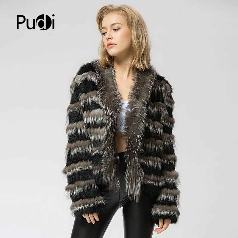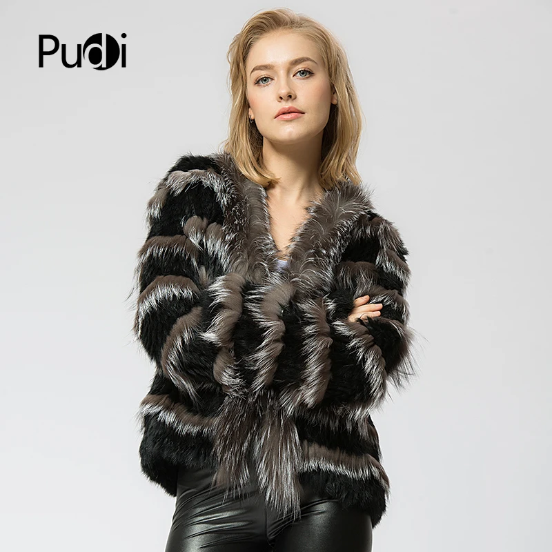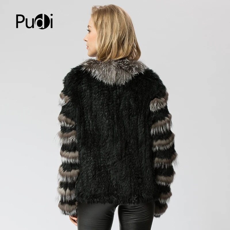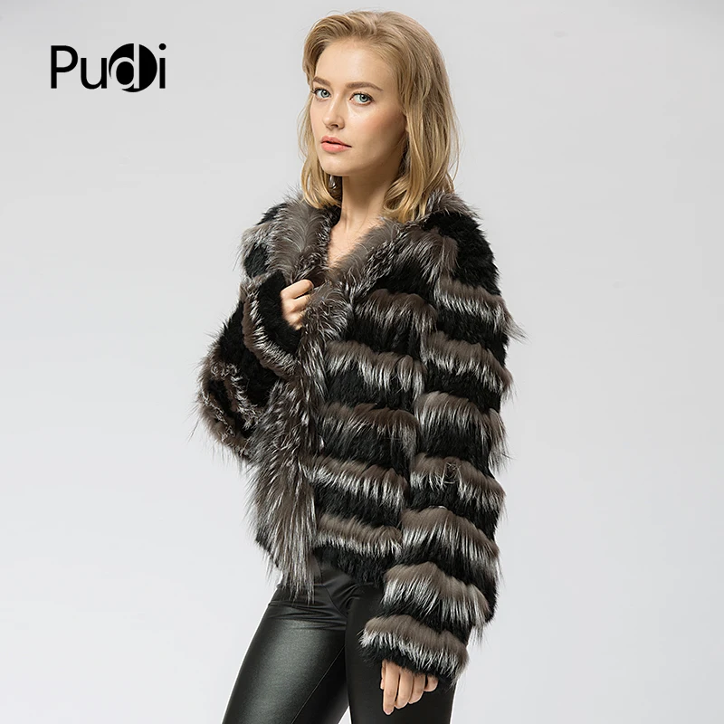 CR048 Knit Knitted Real Rabbit & Silver Fox Fur Coat Jacket Overcoat Women's Fashion Winter Warm Genuine Fur Coat Ourwear