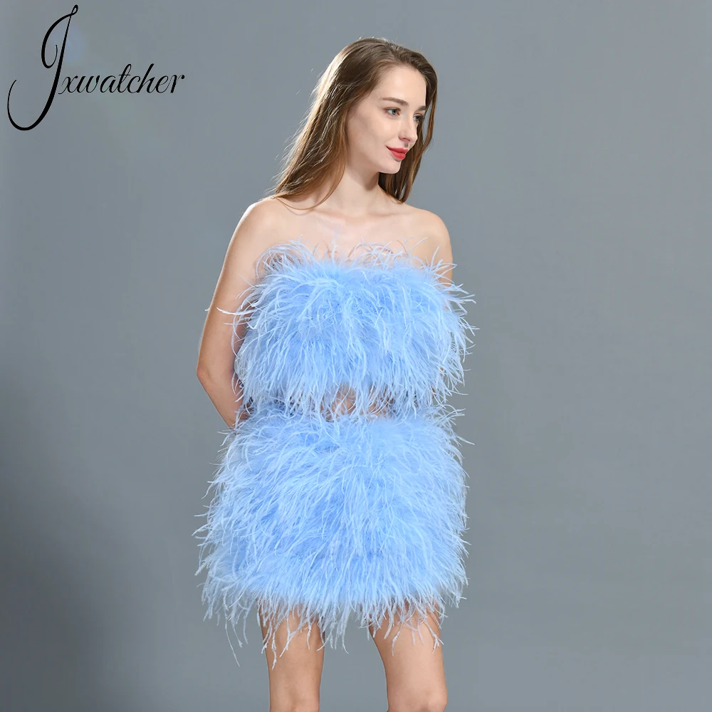 Jxwatcher Natural Ostrich Feather Top And Skirt Set For Women Summer Real Fur Sexy Bodycon Wrap Two Piece Set 2022 New Arrival