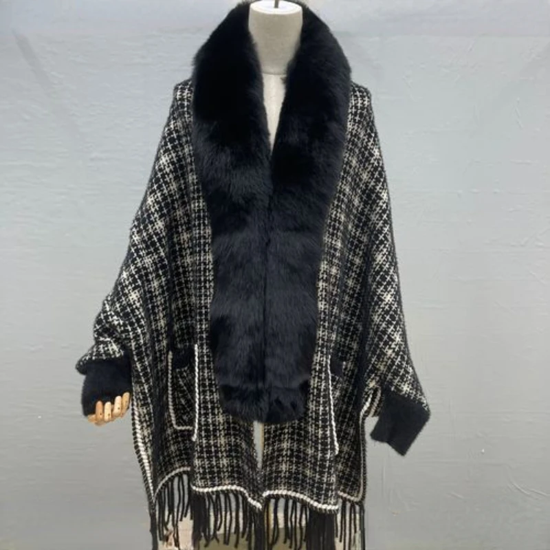 2023 Real Fox Fur Collar Coat Winter Jacket Women Warm Knitted Poncho Long Sleeve Tassel Scarf Femme Vintage Cardigan Oversize
