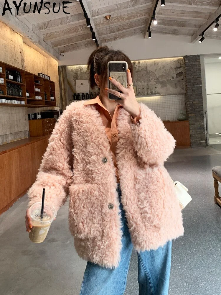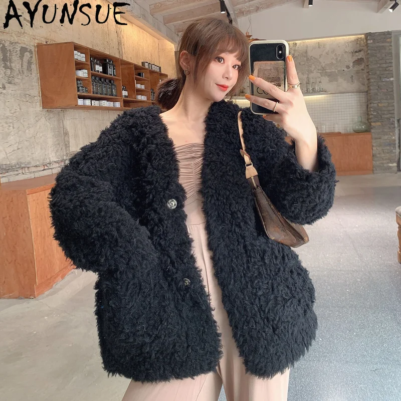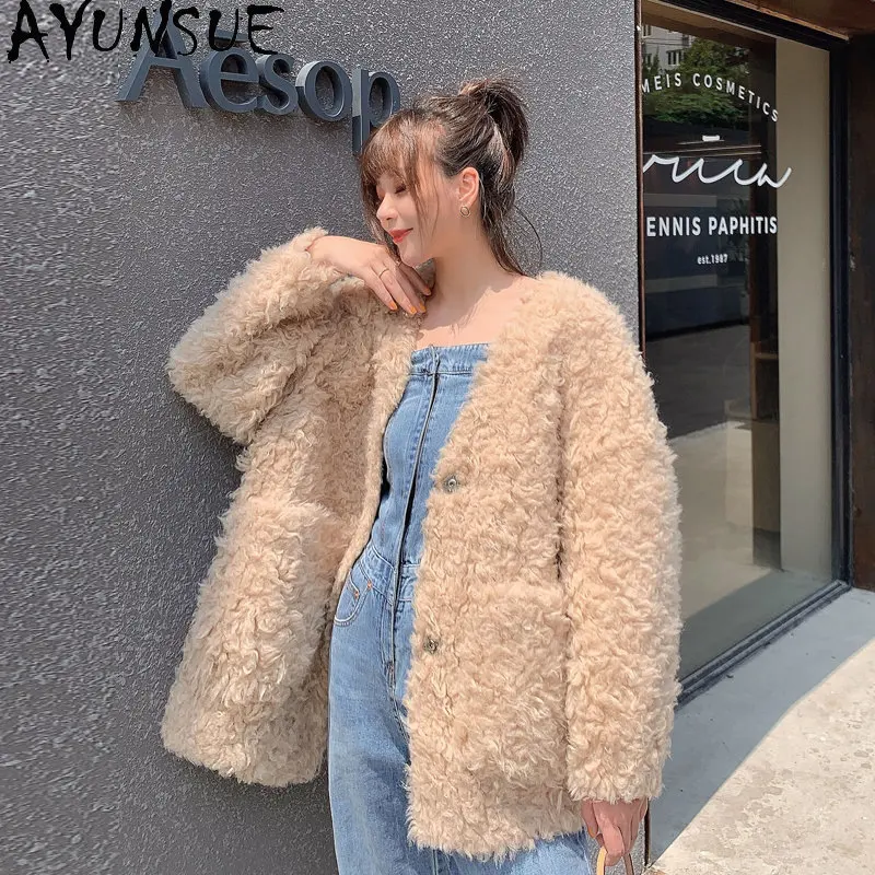 AYUNSUE 100% Wool Jacket for Women 2023 Winter Autumn Sheep Shearing Coat Women Mid-length Fur Coats Wool Jackets V-neck Outwear