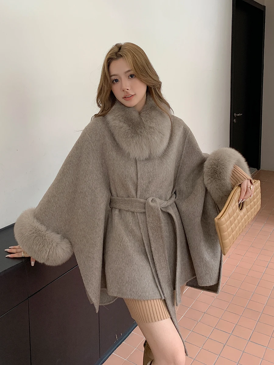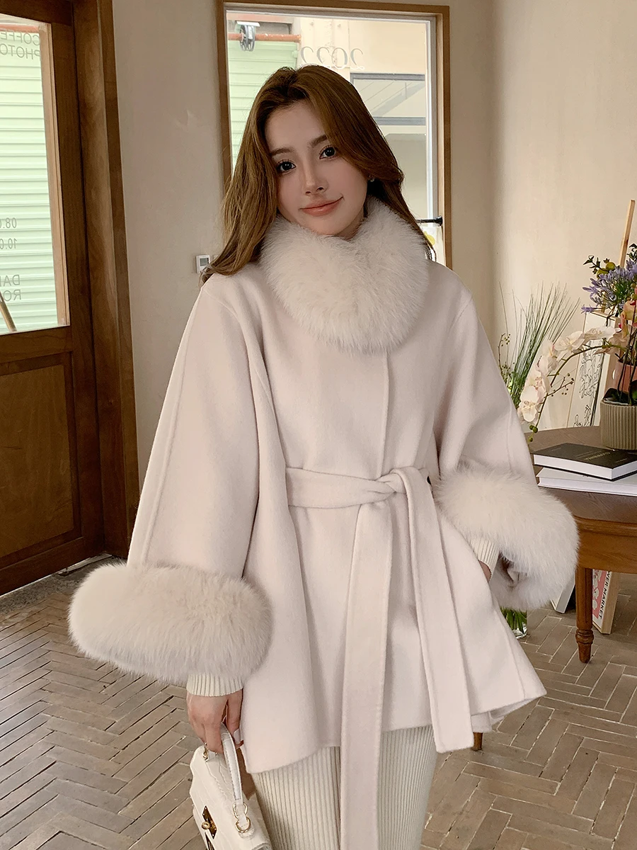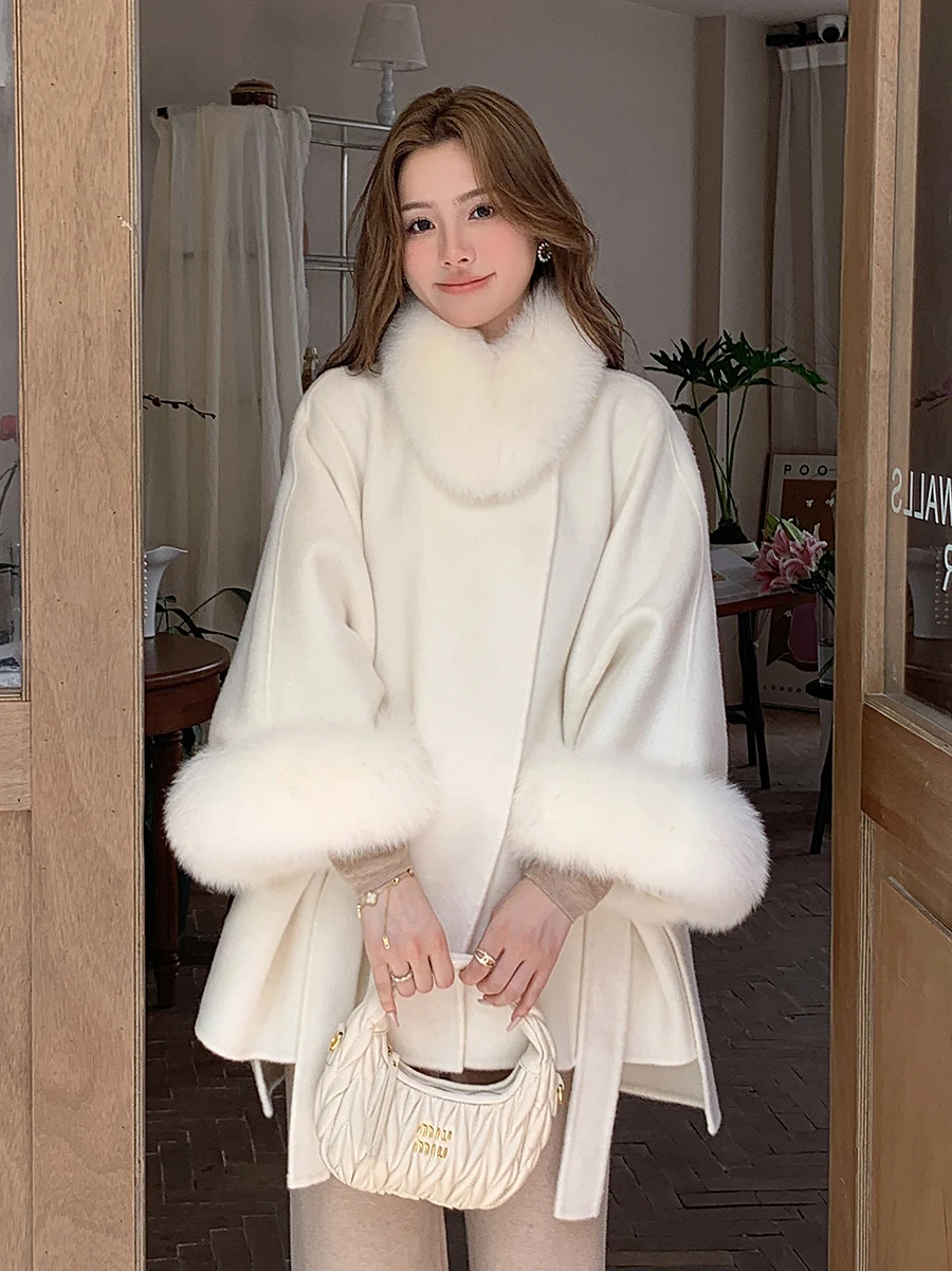 New Reversible Cashmere Coat Mid-Length Fox Fur Collar Shawl Korean Style High-Grade Loose Cape Woolen Coat Women