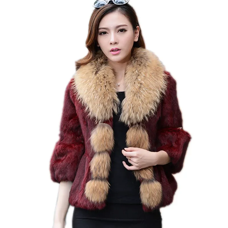 2022 Real Fur Coat Women Whole Leather Rabbit Fur Jacket for Women Elegent Female Short Winter Slim Raccoon Fur Collar Outwear F