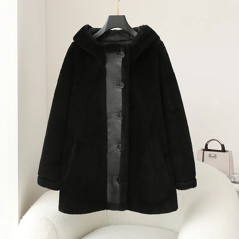 PDUI Women Real Wool Fur Coat Winter Warm Female Girl Sheep Shearing Hood Jacket Parka OverCoat CT147