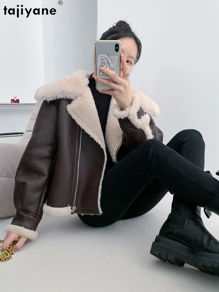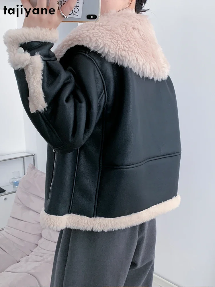 Tajiyane 100% Sheep Shearing Jacket for Women Short Wool Coat Female Clothes Short Motorcycle Fur Coats Turn Down Collar Abrigos