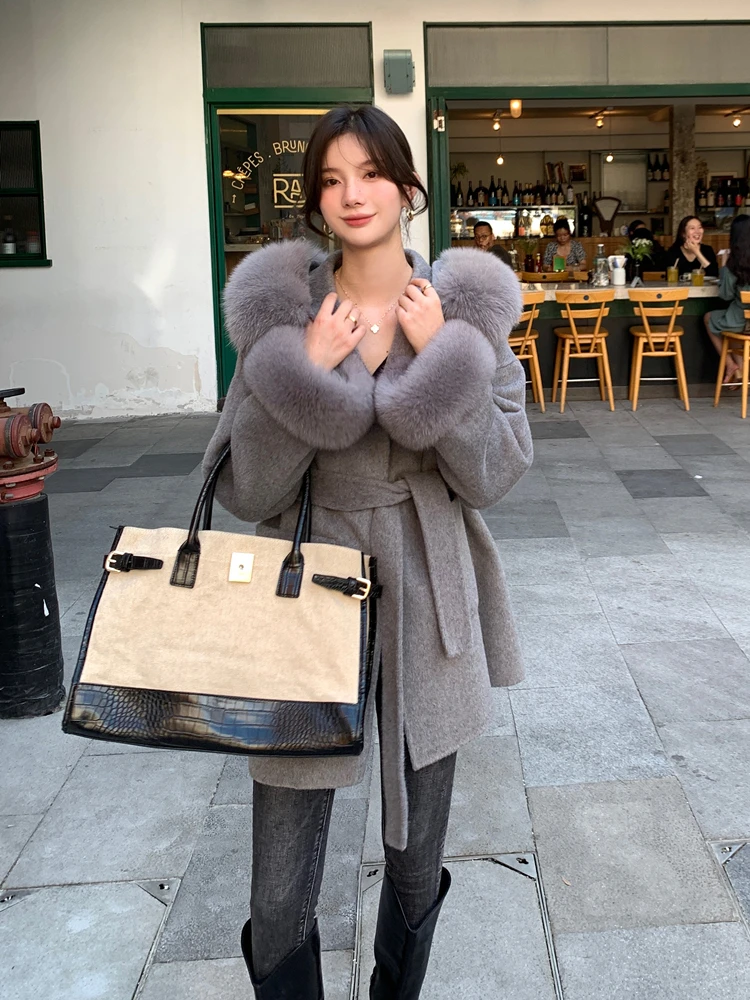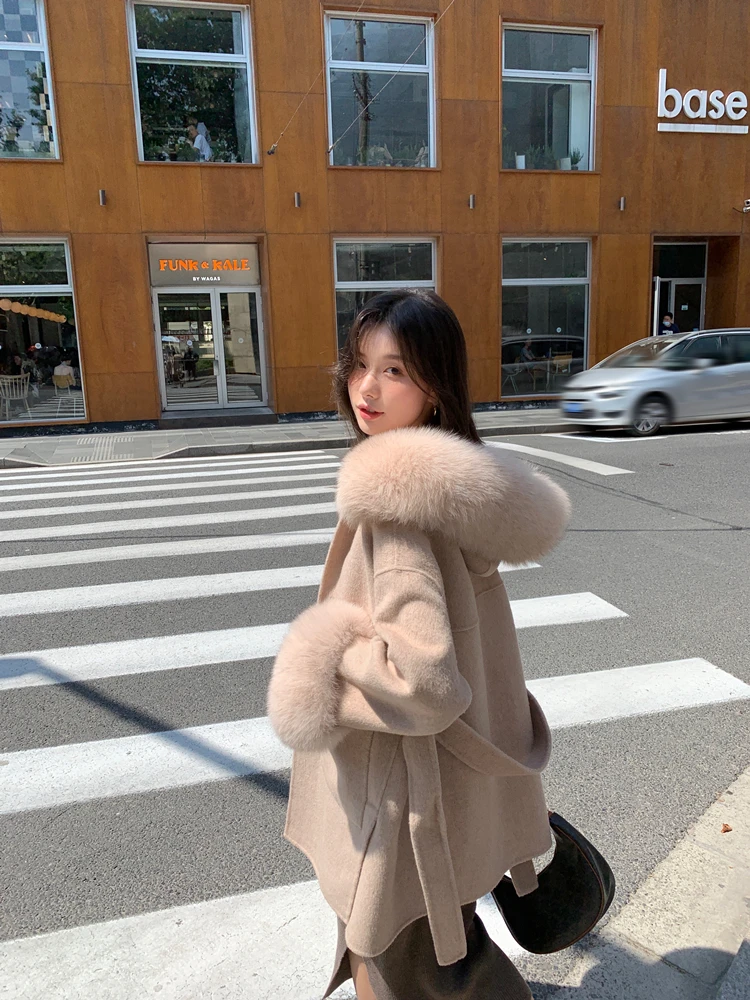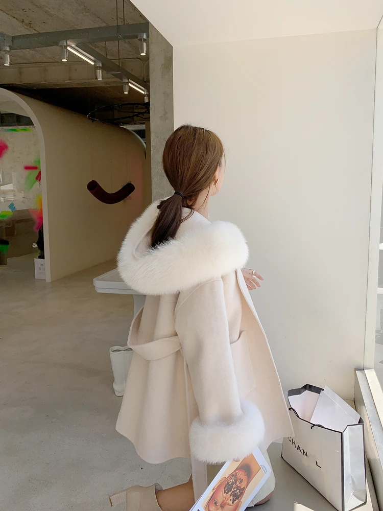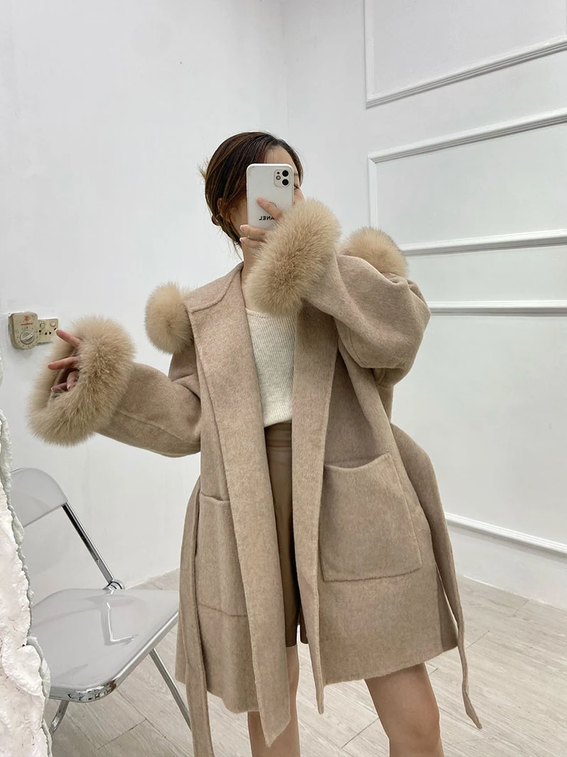 2022 Real Fur Coat Winter Jacket Women 100% Natural Fox Fur Collar Cuffs Cashmere Wool Blends Oversize Outerwear New