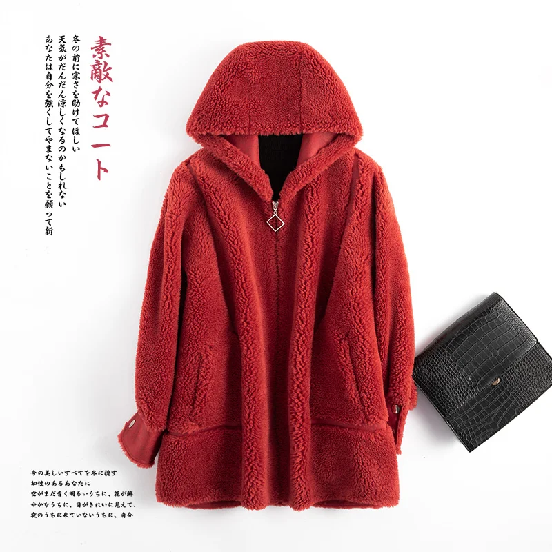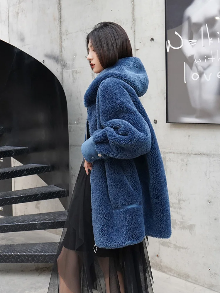 AYUNSUE Sheep Shearling Real Fur Coat Female Wool Coats Winter Jacket Women Hooded Long Jackets for Women Suede Lining MY4188