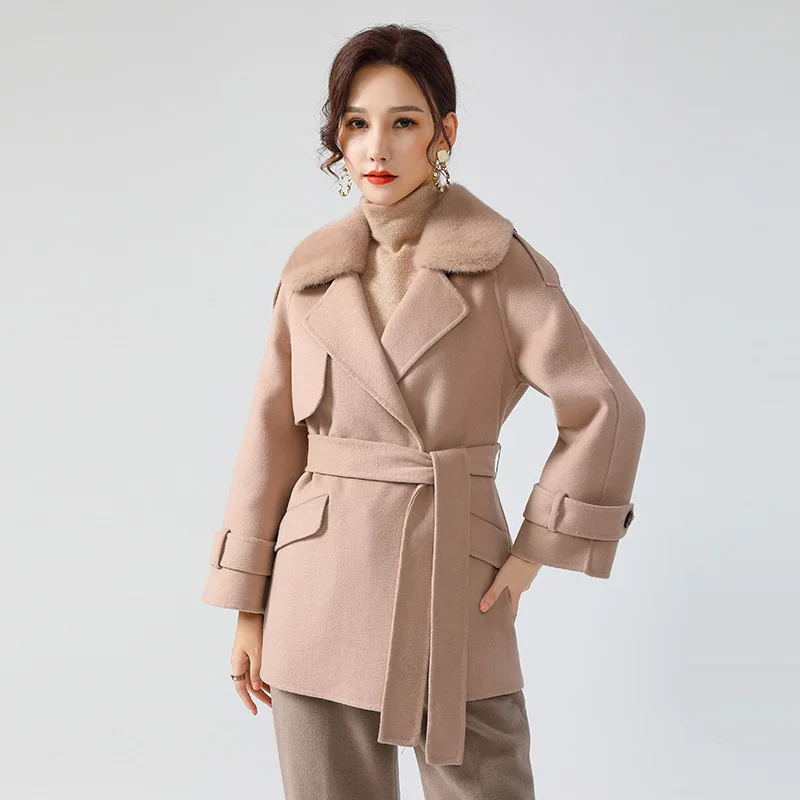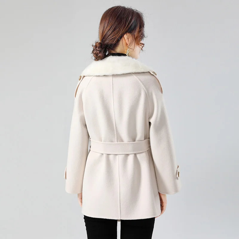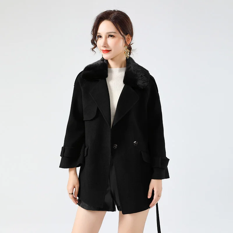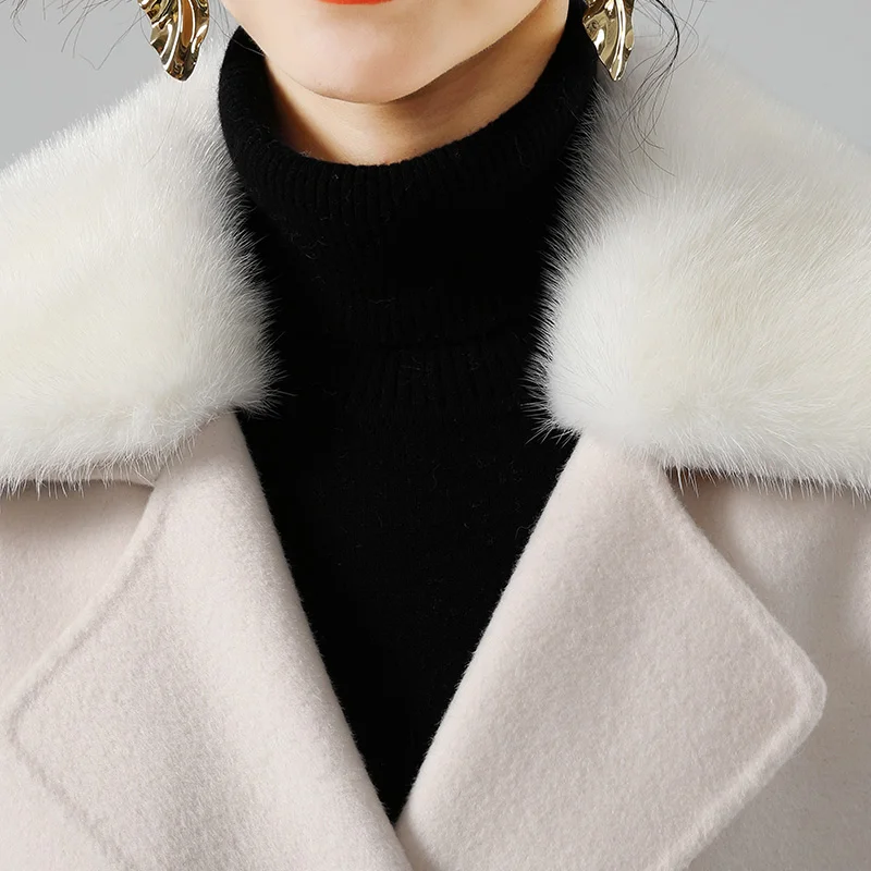 2021 Women Winter Real Fur Coat Jacket with Mink Fur Collar Ins Hot Lady Over Size Wool Blends Coats Parka Trench Short Warm