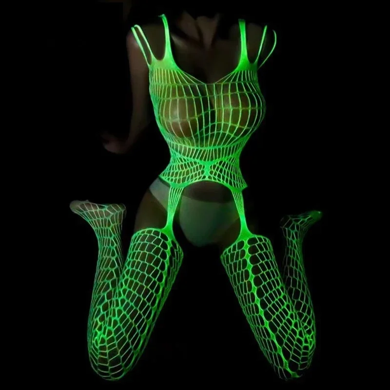 8 Styles Women Sexy Luminous Fishnet Romper Stockings Attractive Shining Hollow-Out Bodysuit Pole Costume Bar Night Party Wear