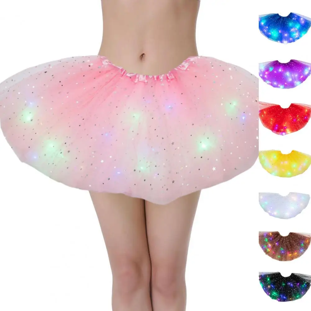 Women LED Skirt Mini Pleated Luminous Skirt Star Sequin A-line Loose Hem Lace Club Dance Party Performance Short Skirt