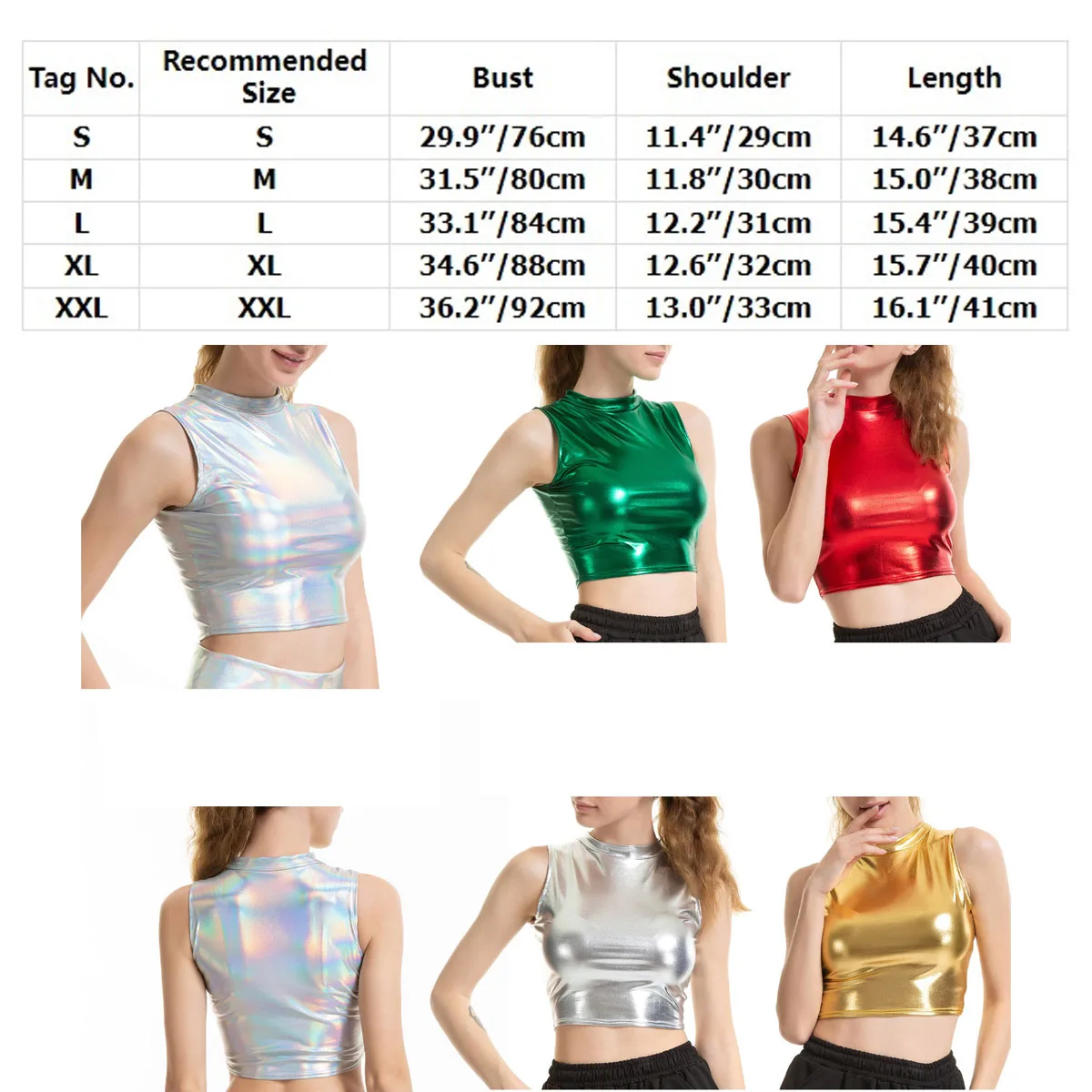 Shiny Metallic Tank Tops Womens Sexy Turtleneck Slim Sleeveless Bodycon Vest Crop Top Holographic Leather Rave Dance Clubwear