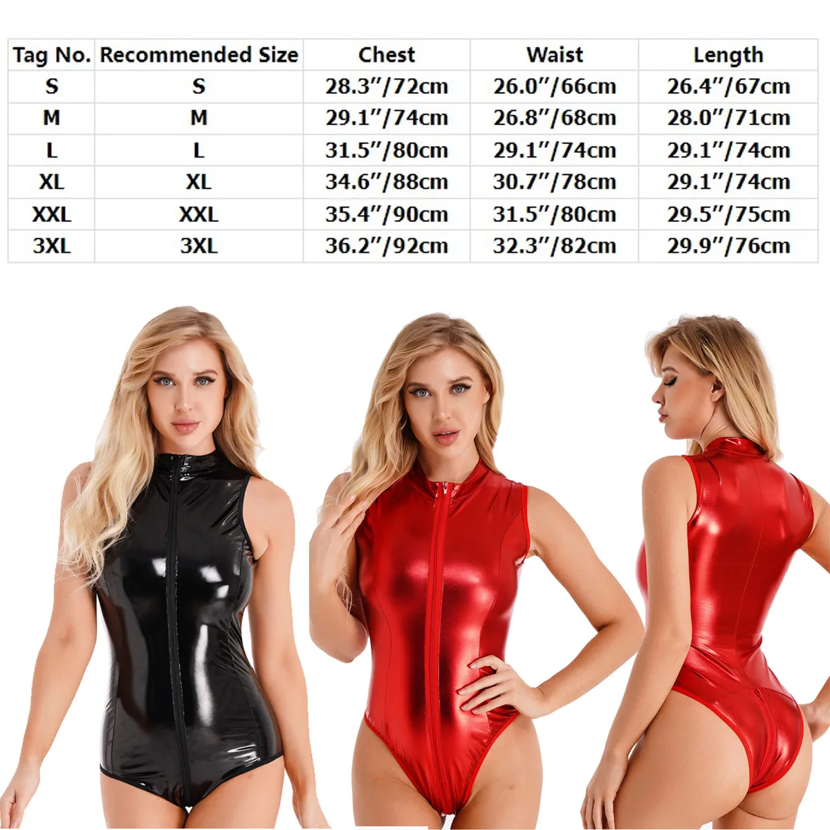 Sexy Zipper Shiny Metallic Bodysuit Women Patent Leather Latex Leotard One-piece Bikini Monokini Swimsuit Jumpsuit Clubwear