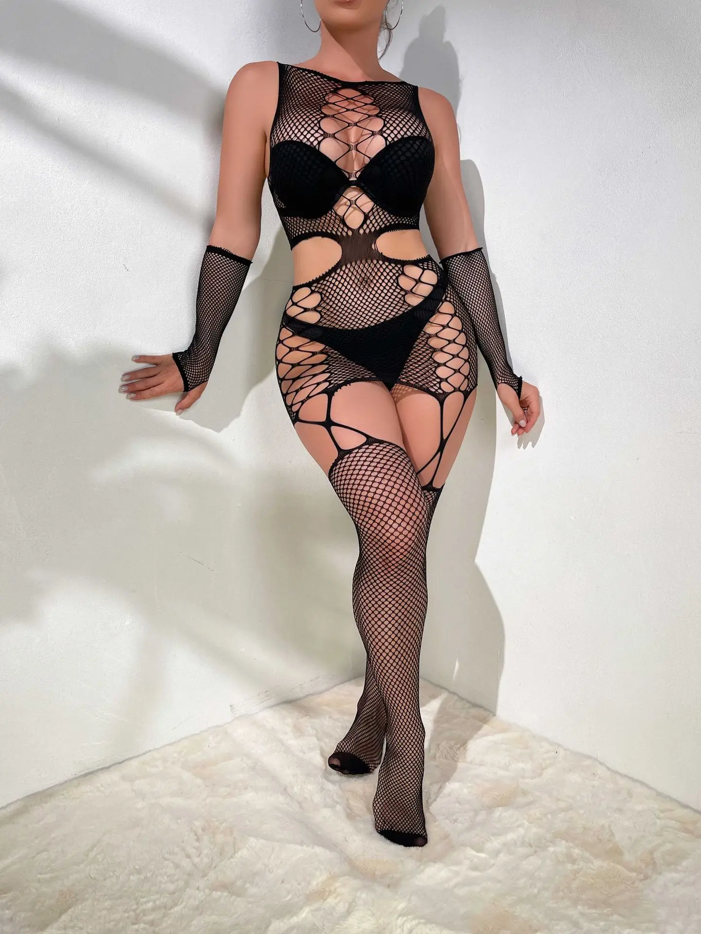 Girls Erotic Bodystocking Exotic Dance Wear Tights Porno Fishnet Lingerie Sexy Jumpsuits Elastic Underwear Teddies With Gloves
