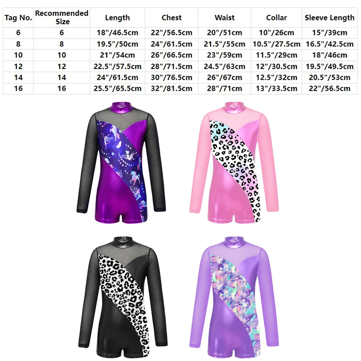 Kids Girls Ballet Gymnastics Leotard Metallic Mesh Long Sleeve Leopard Print Dance Bodysuit Jumpsuit Athletic Shorty Unitard