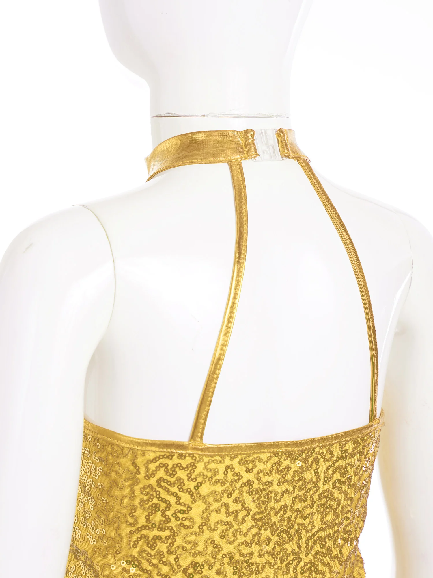 Kids Girls Jazz Dance Vest Sleeveless Backless Halter Shiny Sequin Crop Top Cheerleading Gymnastics Stage Performance Dancewear