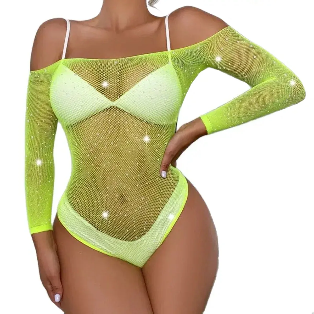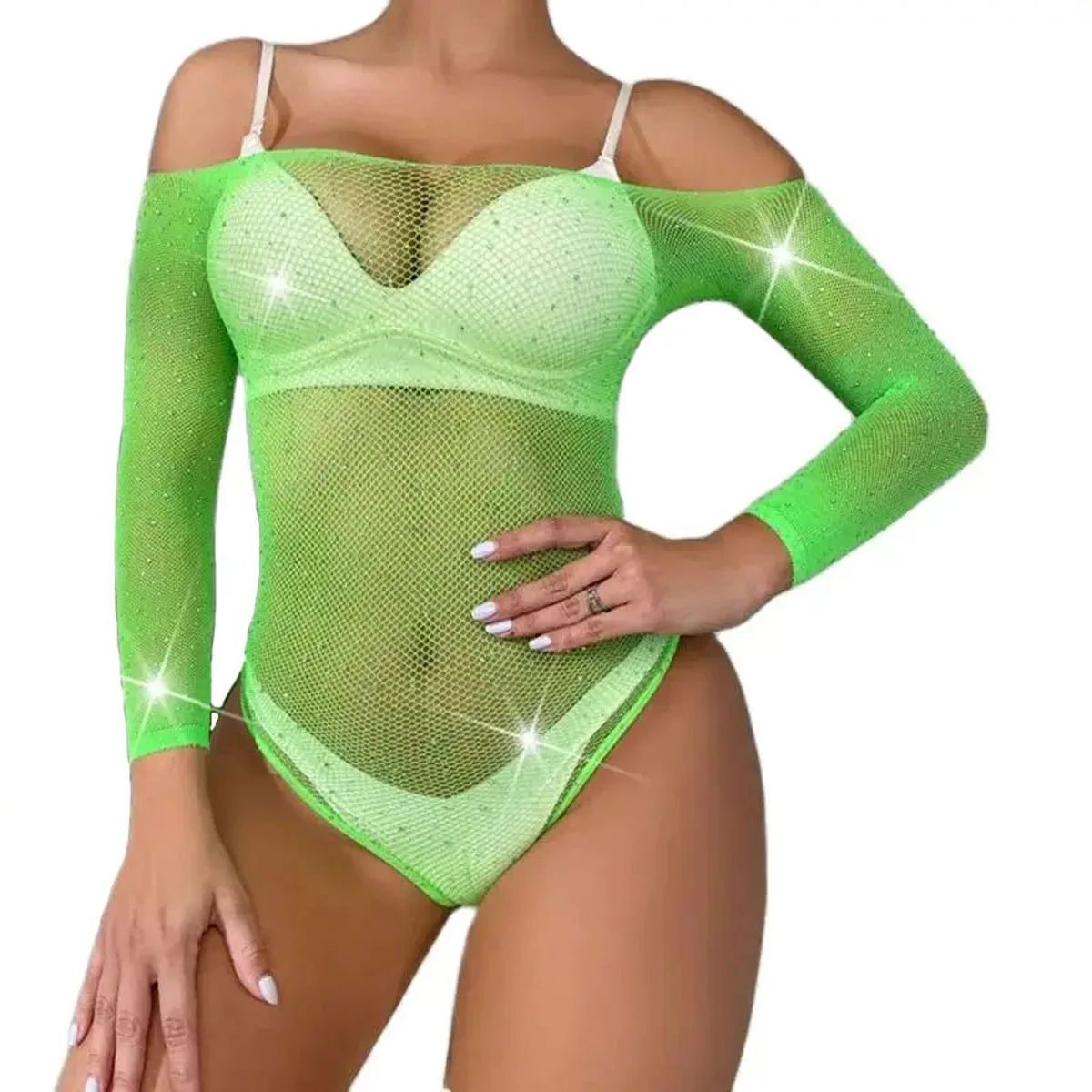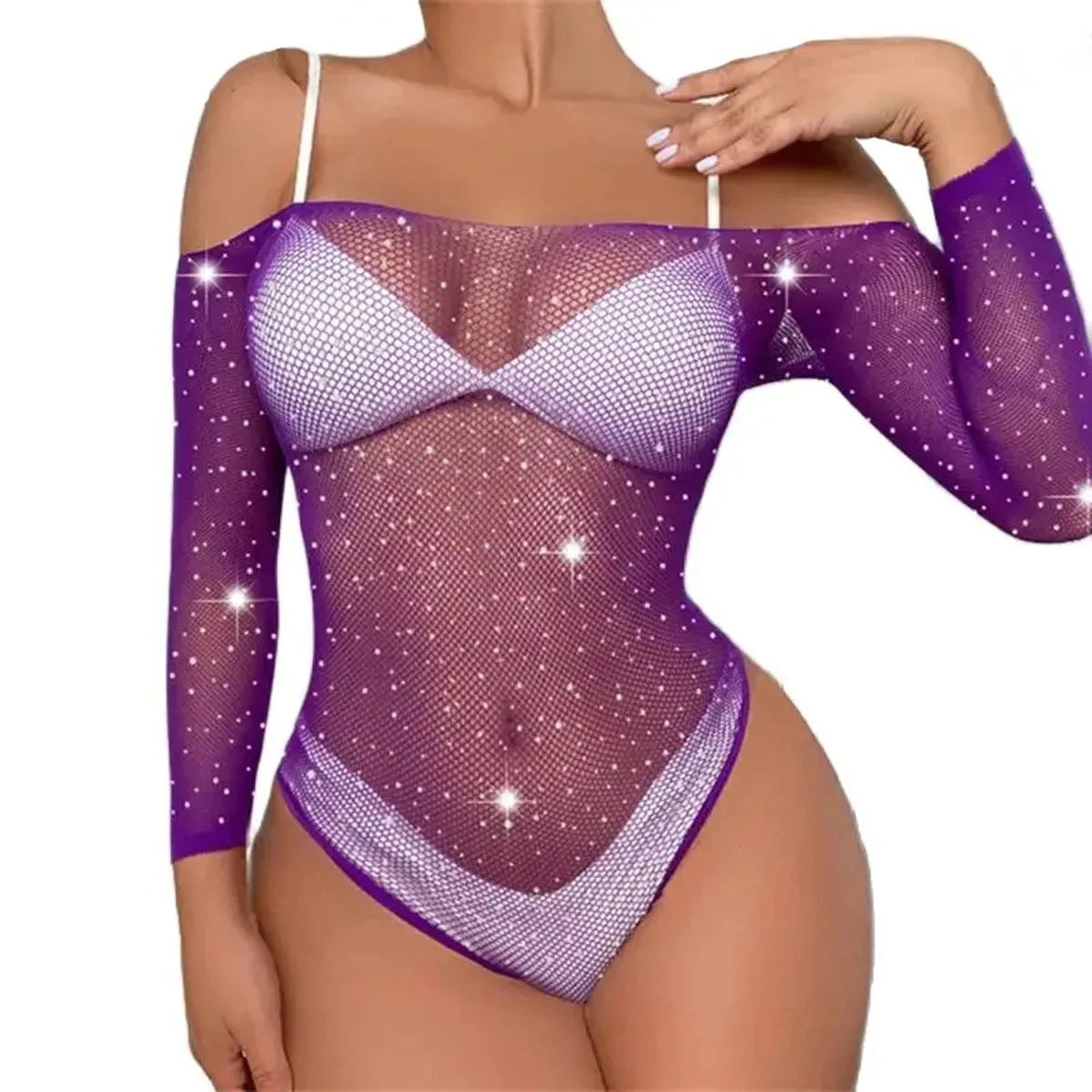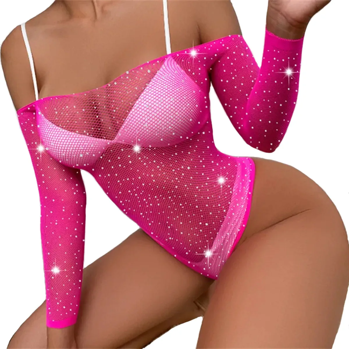 Girls Rhinestone Pole Dancewear Sexy Porno Stripper Outfits Sexuales Bondage Tights Fishnet Performance Wear Lingerie Teddies