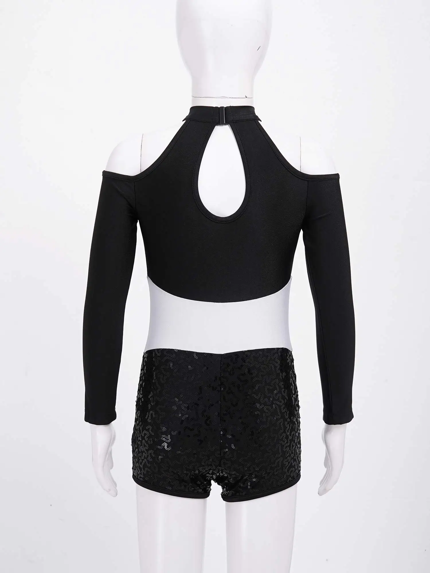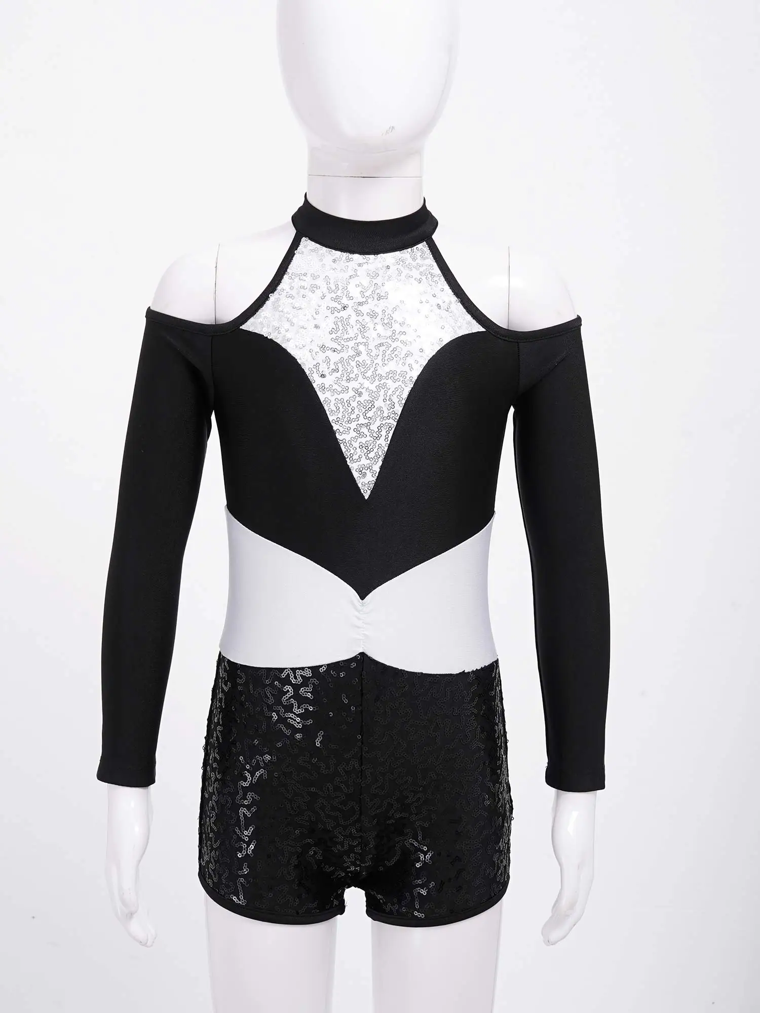 Kids Girls Shiny Sequins Ballet Dance Shorty Unitard Long Sleeve Gymnastics Leotard Modern Jazz Latin Dancing Stage Costumes