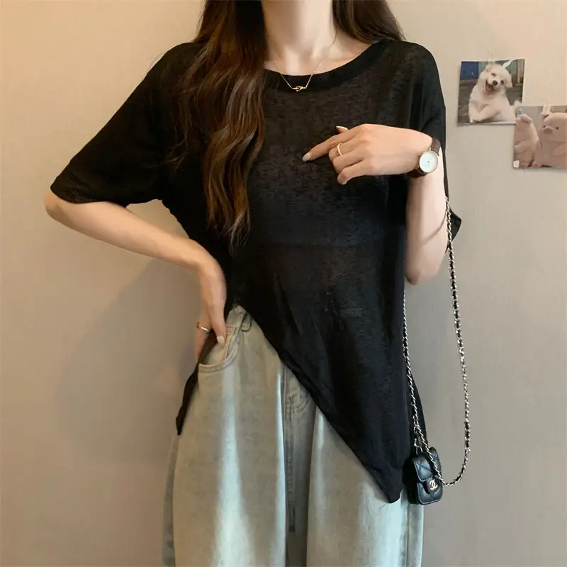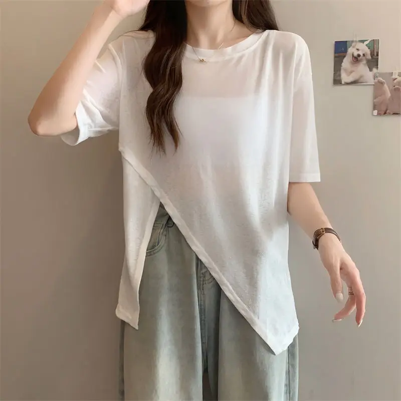 Name | Large size women's dance breathable thin sun protection clothing summer short sleeved slimming slit design feeling top |