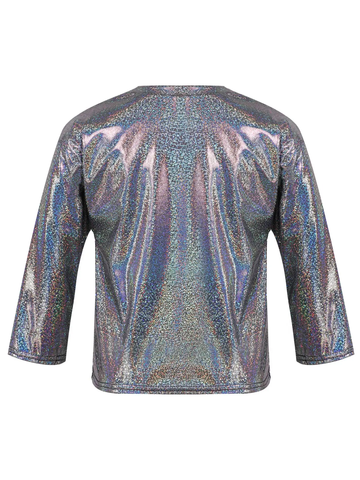Children Boys Girls Shiny Metallic T Shirt Long Sleeve Dance Crop Top Modern Jazz Hip Hop Shirt Blouse Stage Performance Costume