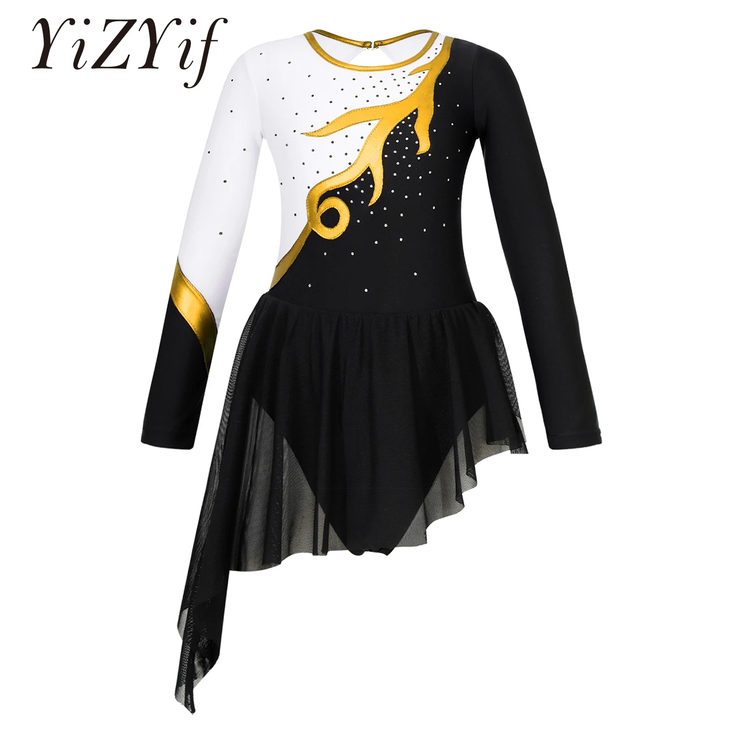 Name | Kids Girls Figure Ice Skating Dress Shiny Rhinestone Long Sleeve Patchwork Tutu Ballet Gymnastics Dance Leotard Dress Dancewear |