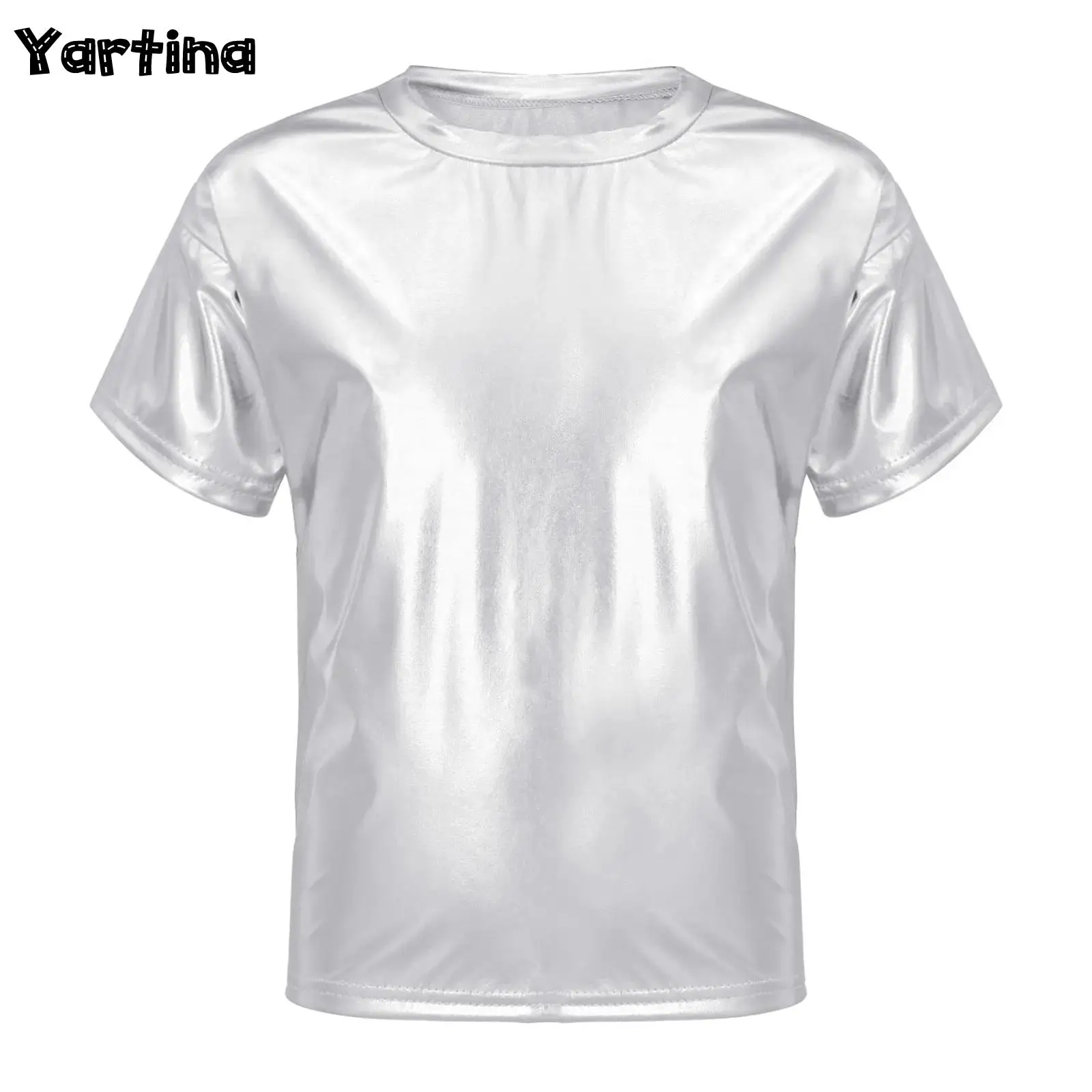 Kids Girls Boys Jazz Hip Hop Dance Performance Tops Metallic Shiny Short Sleeve Round Neck T-shirt Gymnastics Skating Costume
