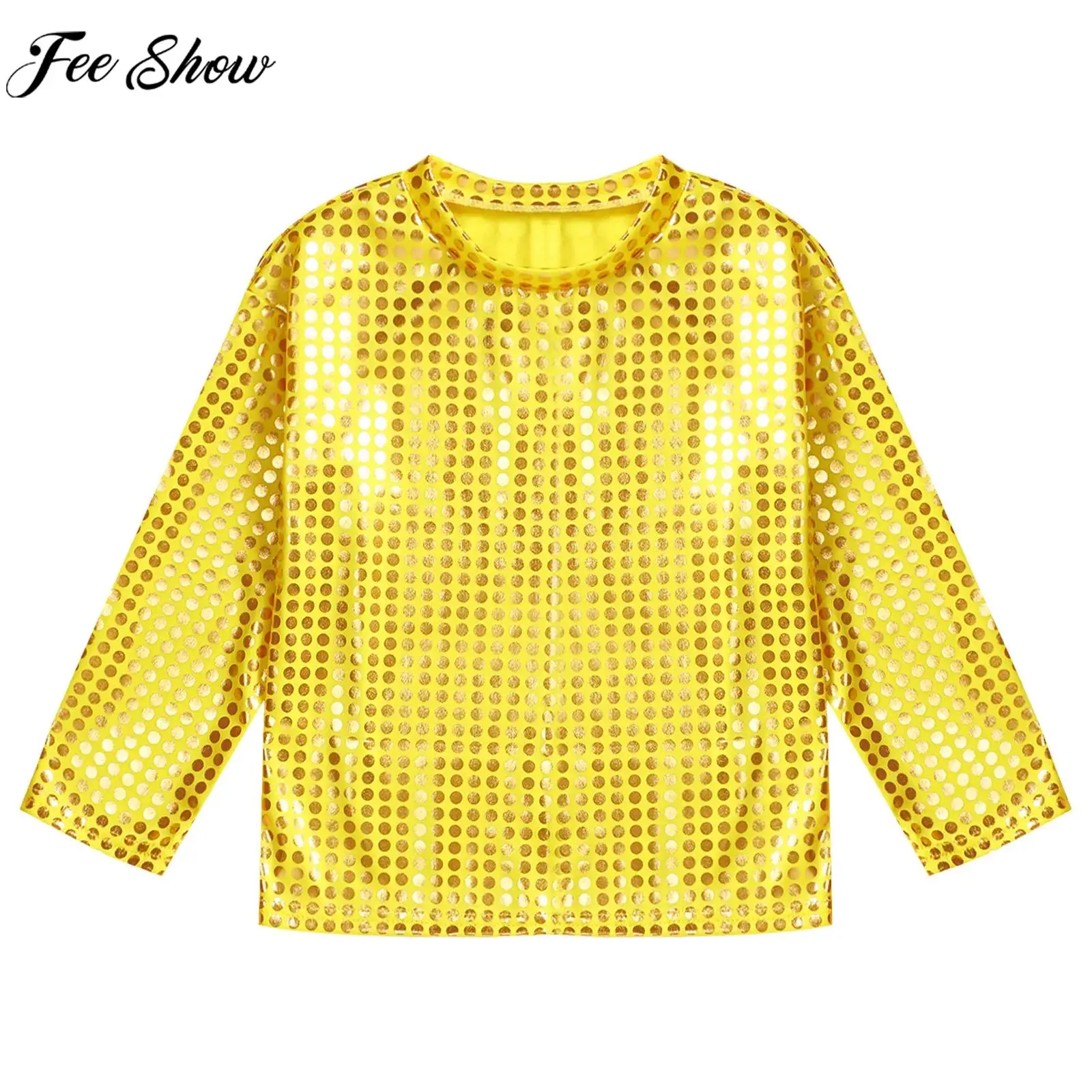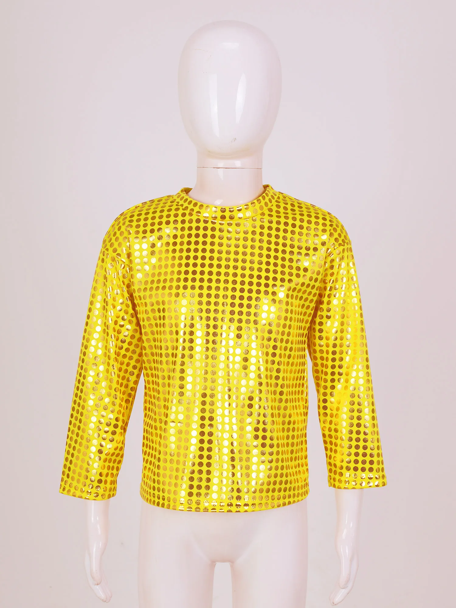 Children Boys Girls Hip Hop Jazz Street Dance Stage Performance Costume Long Sleeve Shiny Sequins T-shirt Top Party Dancewear