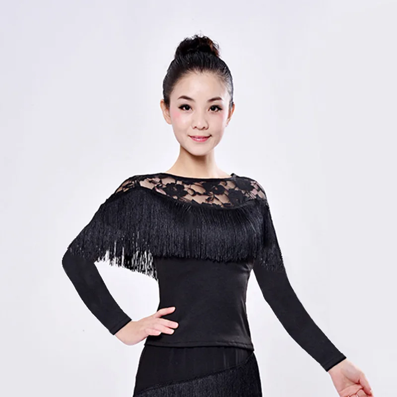 Lace Neck Fringe Design Women Latin Dance Tops Long Sleeve Women Black Latin Dancing Dress Cloth Tango Dancing Red T-shirts 2023
