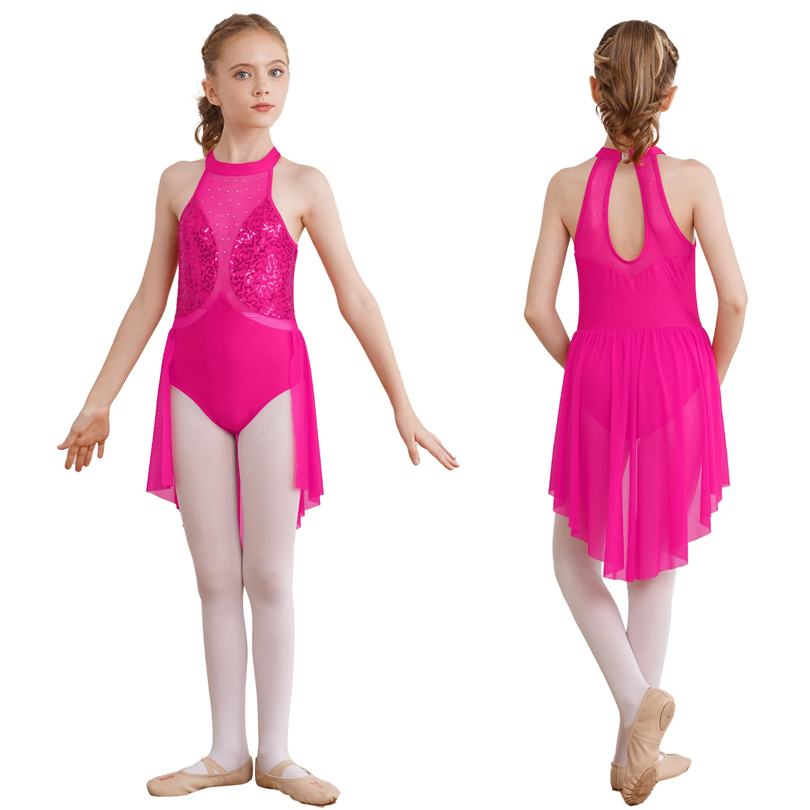 Name | Girls Gymnatics Leotard Dress Sparkly Sequin Sheer Mesh Keyhole Back Sleeveless Dresses Figure Skating Lyrical Dance Dress |