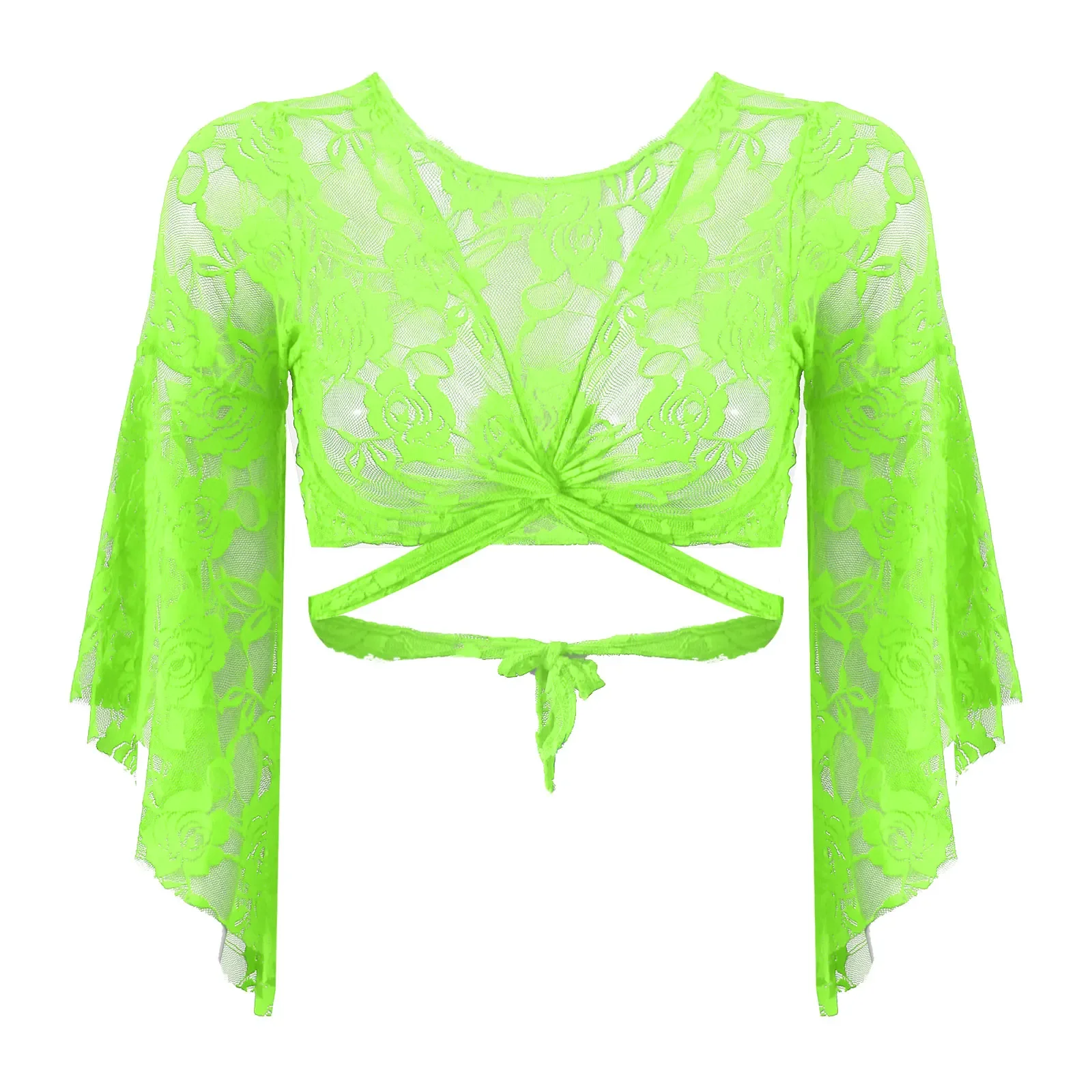 Womens Sheer Lace Shrugs Belly Dancewear Ladies Belly Dance Top 3/4 Flare Sleeve Lace-up Cardigan Wraps Crop Top