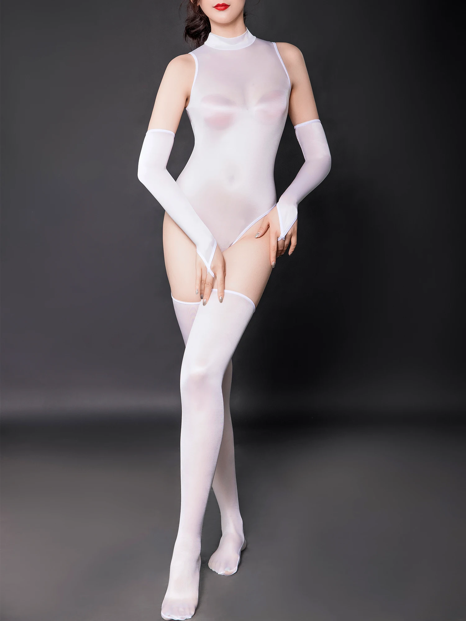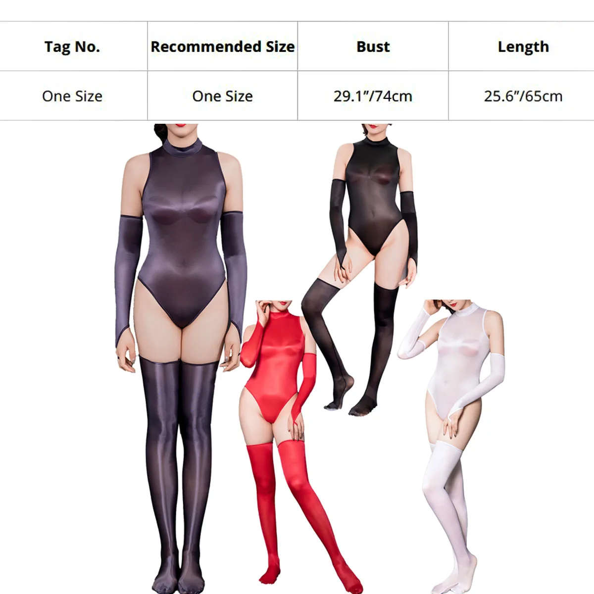 Women Sexy Glossy Bodysuit with Stocking Sleeve Outfits Oil Shiny Stretchy High Cut Bodycon Leotard Jumpsuit Pole Dance Clubwear