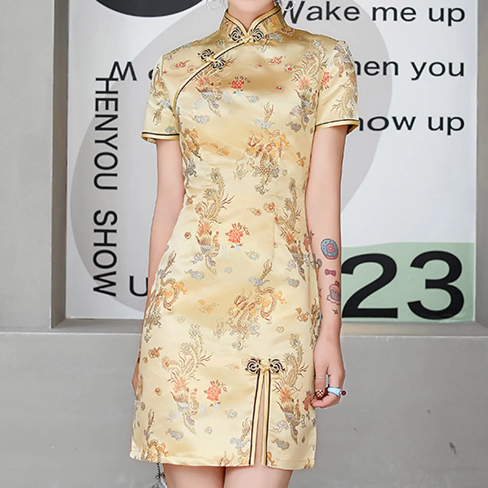 Women's Cheongsam Dresses Cheongsam Split Mini Dress with Colorful Dragon Patterns Traditional Chinese Formal Wear