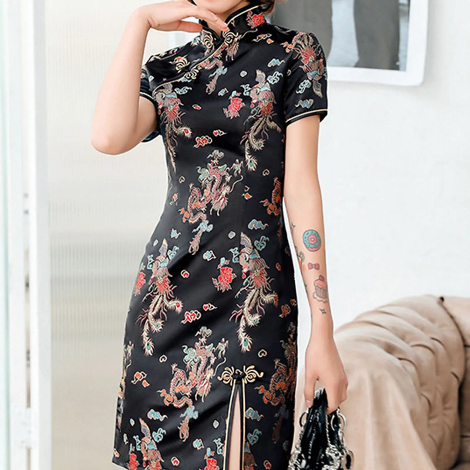 Women's Cheongsam Dresses Dragon Pattern Print Dress Qipao Mini Bodycon Dresses Vintage Short Sleeve Qipao Gowns