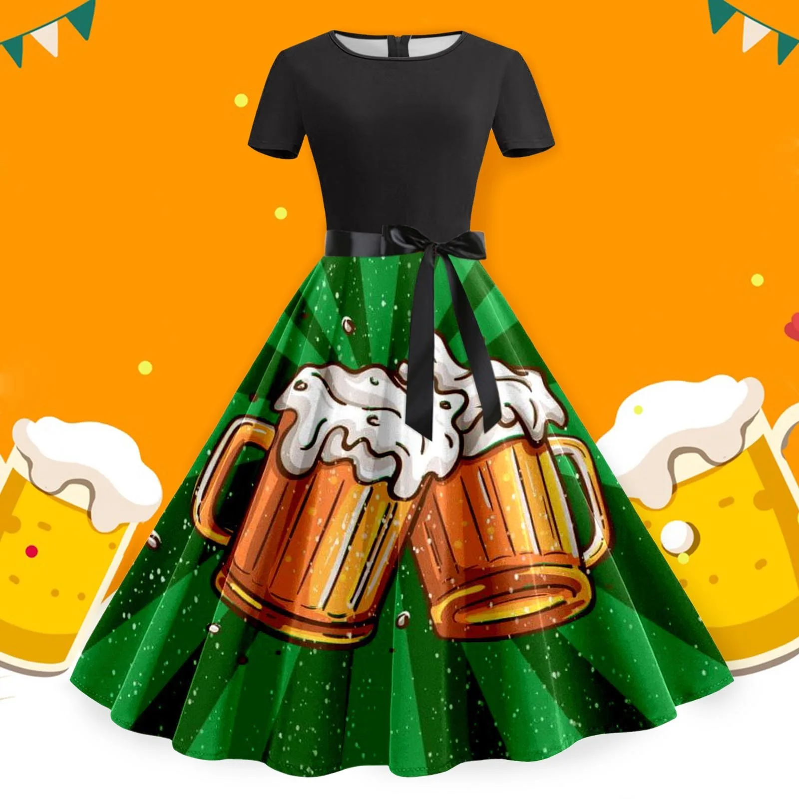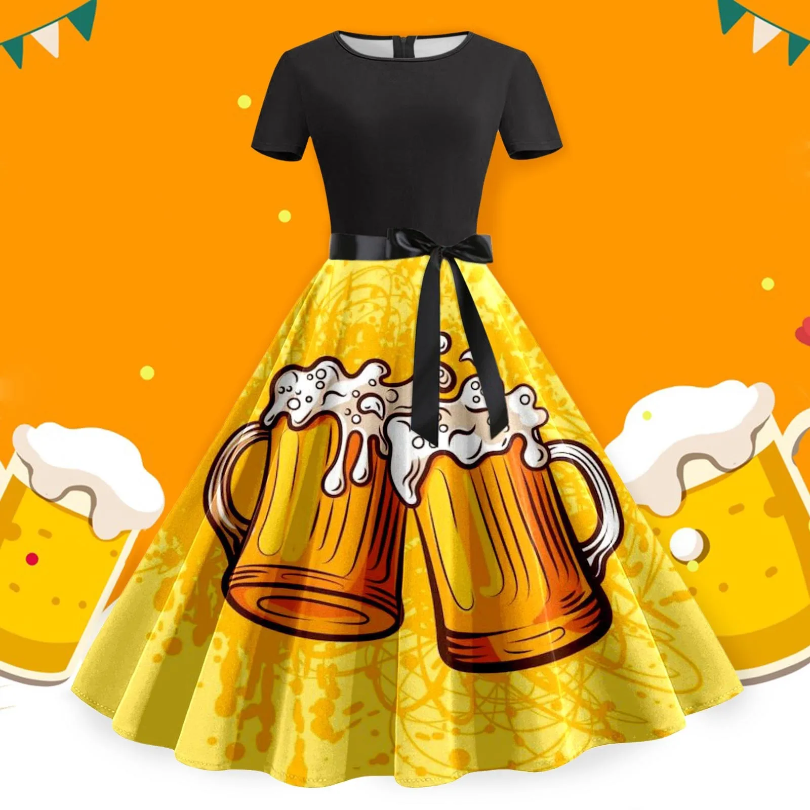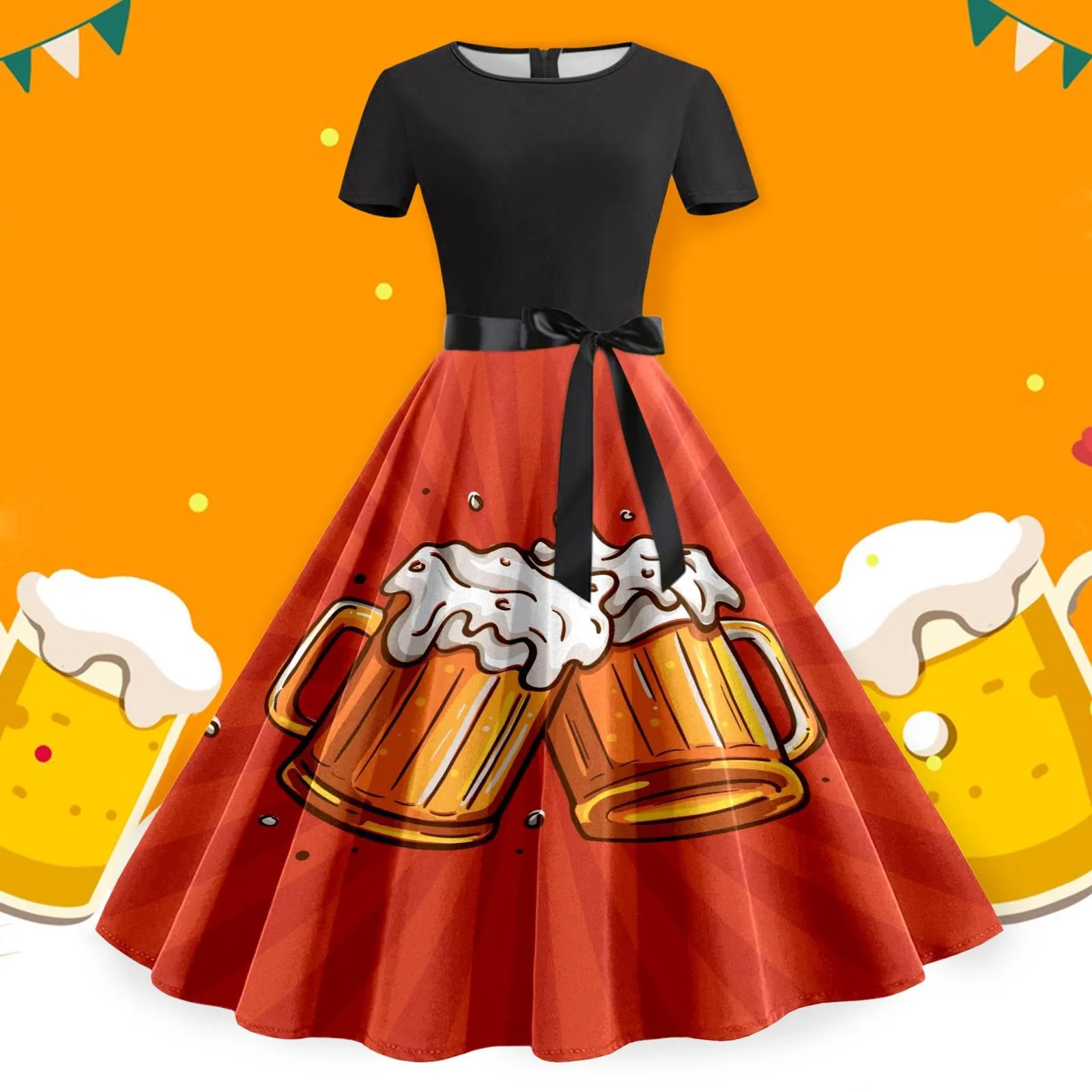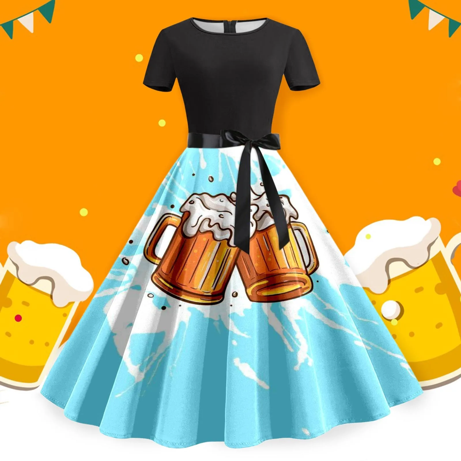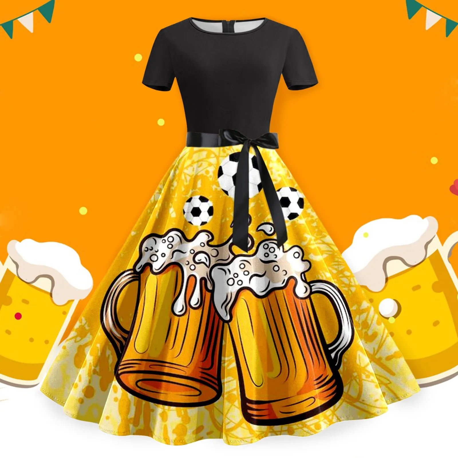 German Oktoberfest Casual Women Dresses Printed Short Sleeve Lace-Up Large Swing Dress Carnival Festival Halloween Vintage Dress