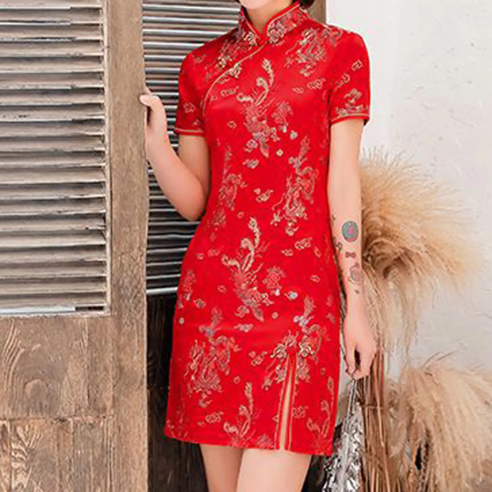 Women's Cheongsam Mini Dress Chinese Dragon Pattern Print Side Split Bodycon Dresses Traditional Chinese Formal Wear