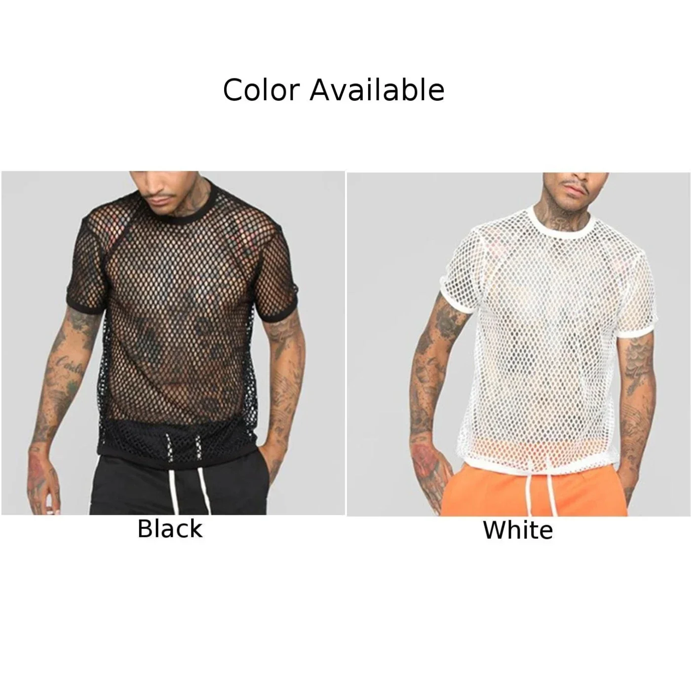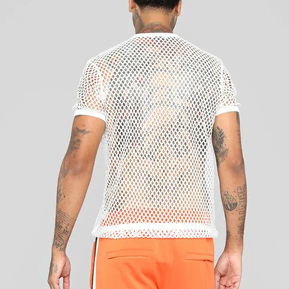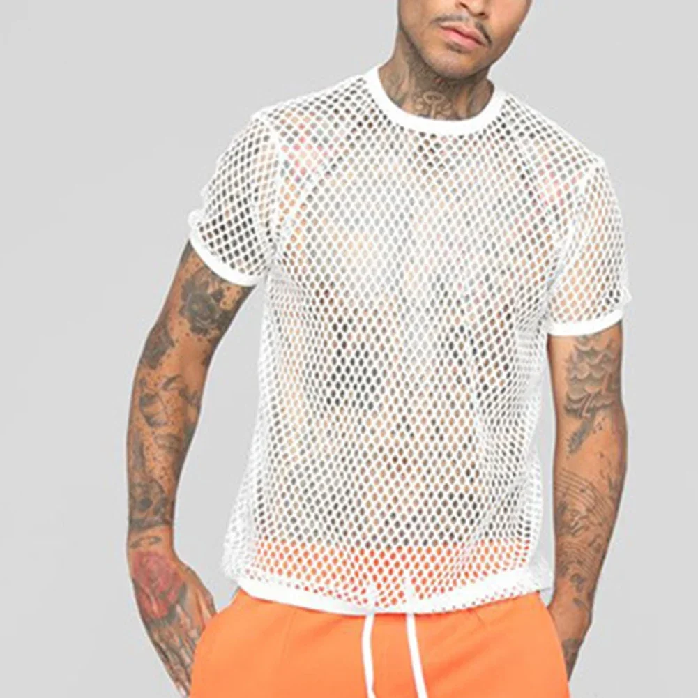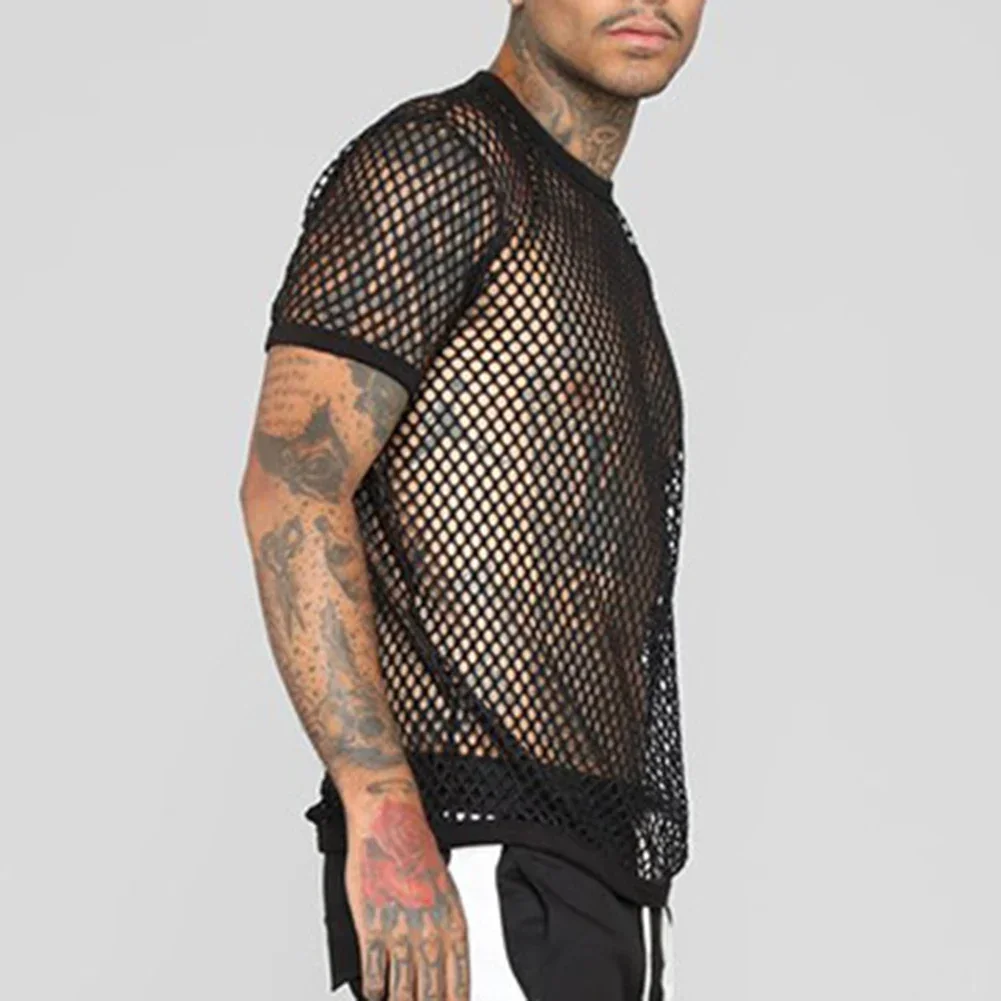 Tee Men Shirts Summer Sexy Sheer Short Sleeve Spring T Shirts Autumn Transparent Crew Neck Fish Net Hollow Net