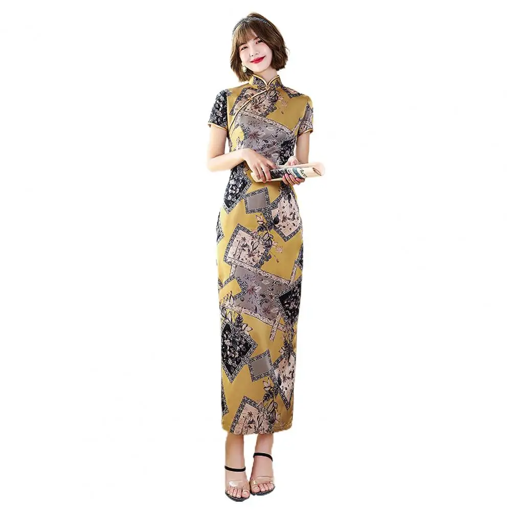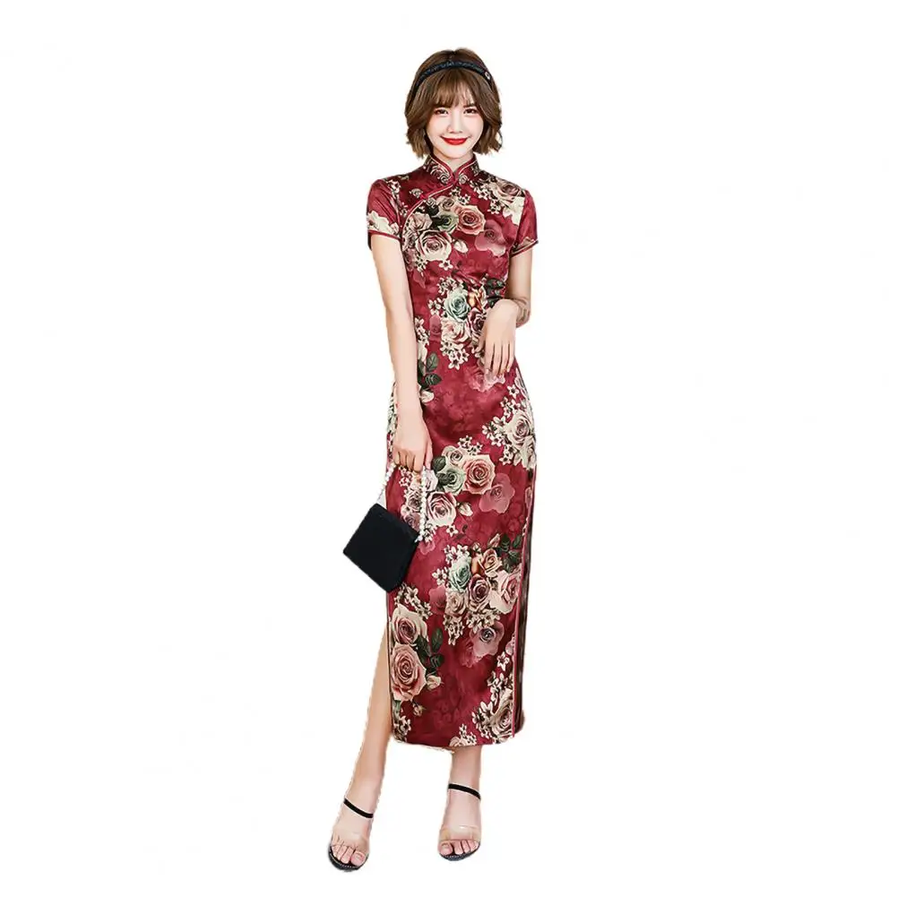 New Women Cheongsam Floral Print Slim Short Sleeve Splits Chinese Traditional Midi Dress for Party