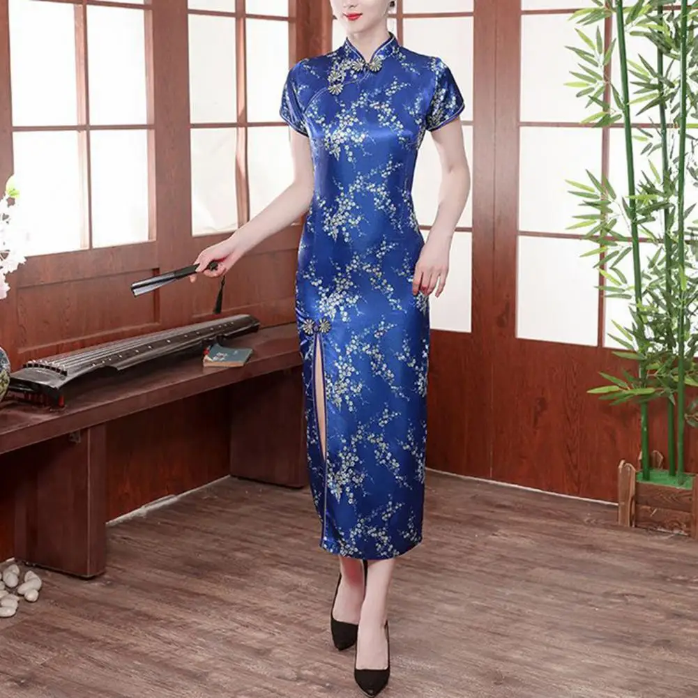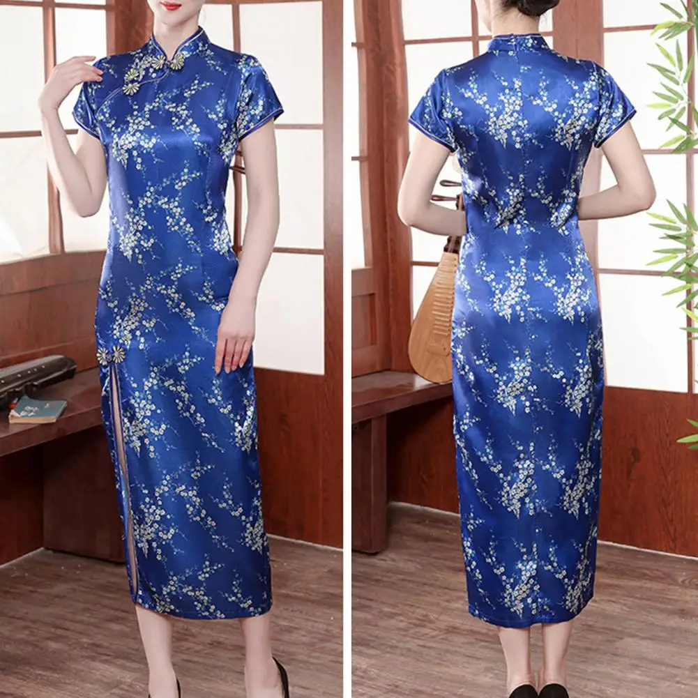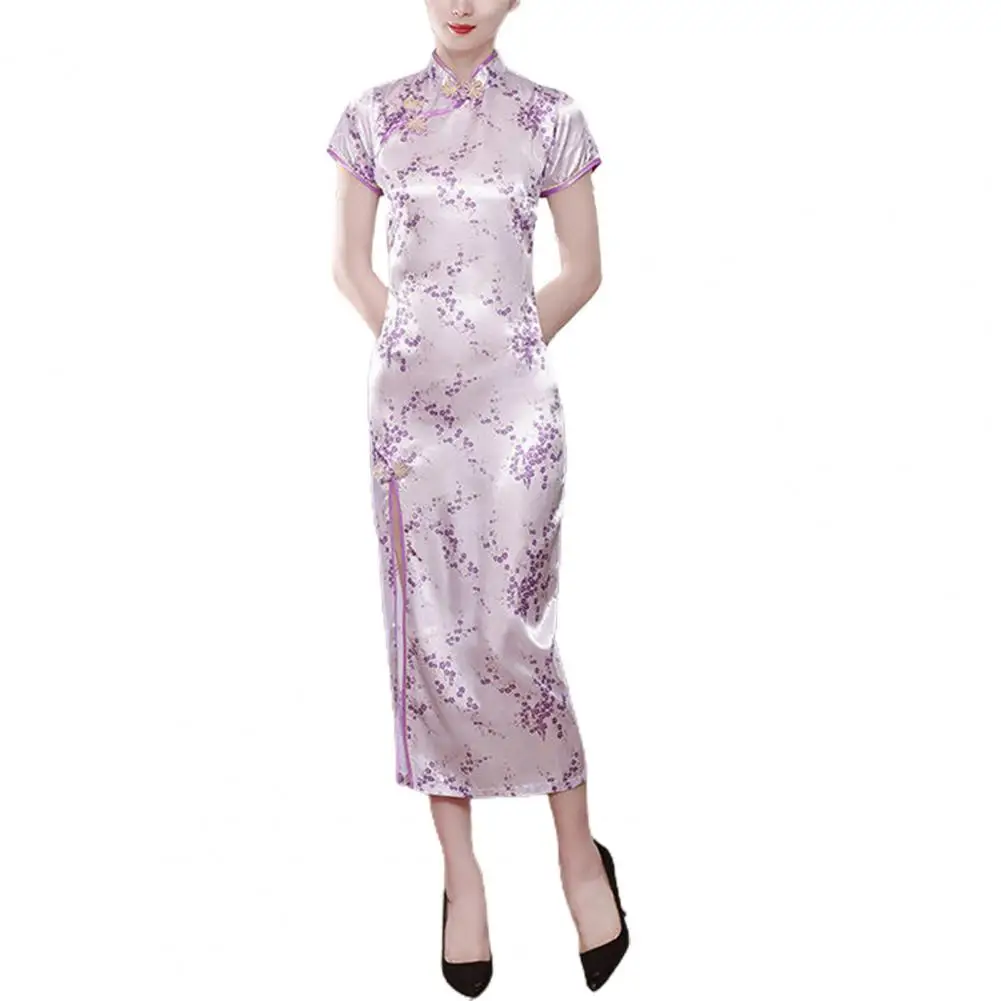 Name | Elegant Printed Dress Faux Satin Long Cheongsam Chinese Style Stand Collar Short Sleeve Qipao Flower Print Side Split Evening |