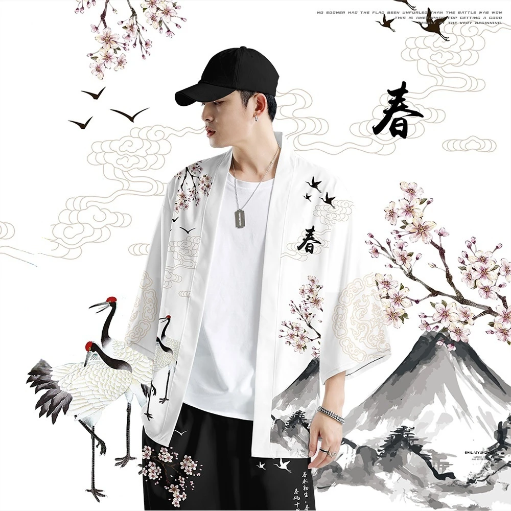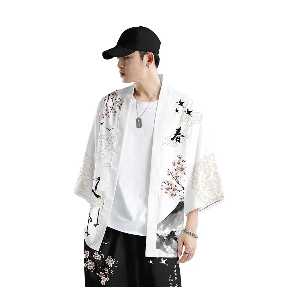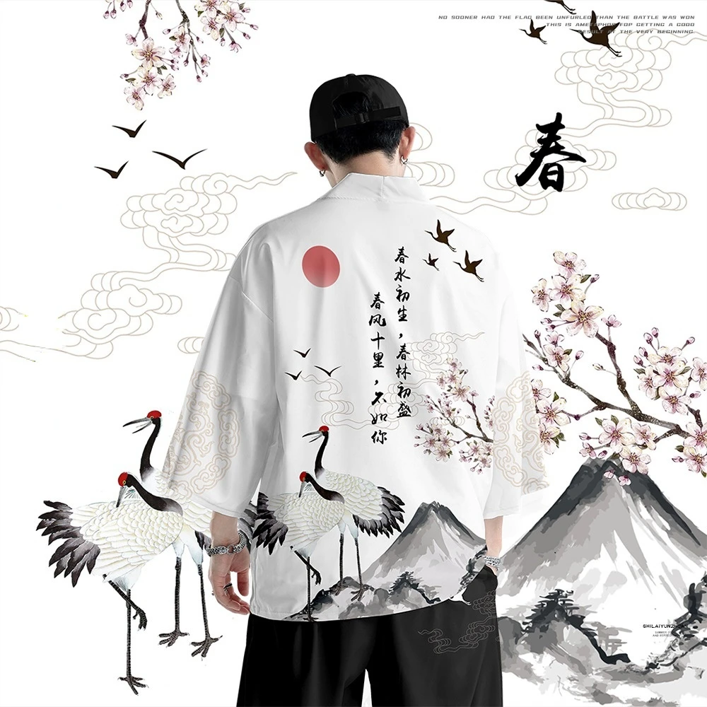 Fashion Japanese Streetwear Men Women Cardigan Cosplay Shirts Chinese Style Crane Print White Kimono Harajuku Samurai Haori