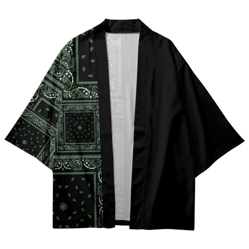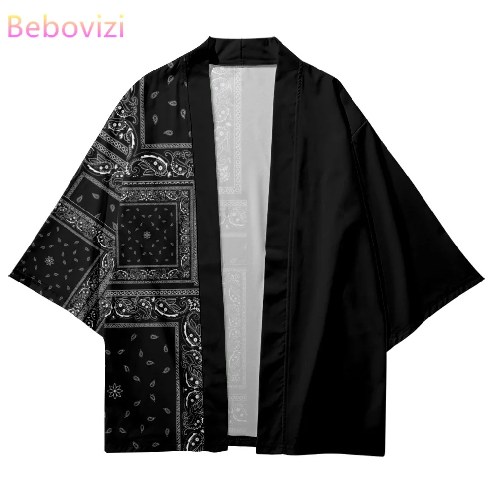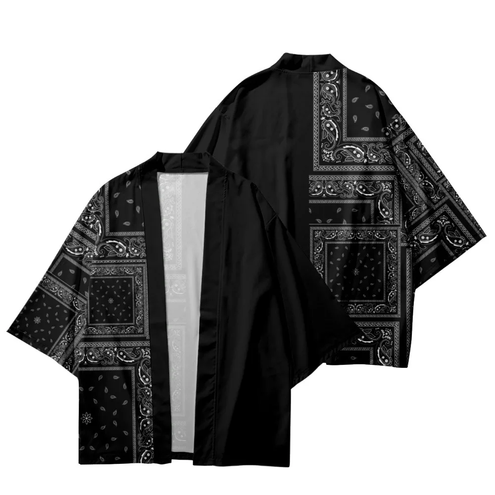 Hot Sale Japanese Streetwear Patchwork Geometric Print Samurai Kimono Cardigan Traditional Fashion Women Men Black Haori Yukata